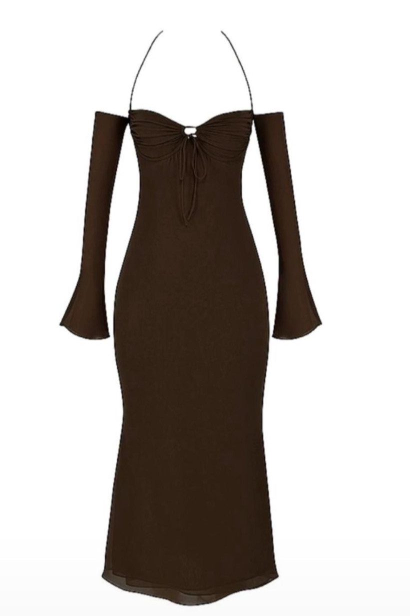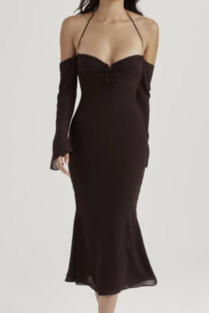 Göğüs bölümü kalp yaka düşük omuz midi elbise