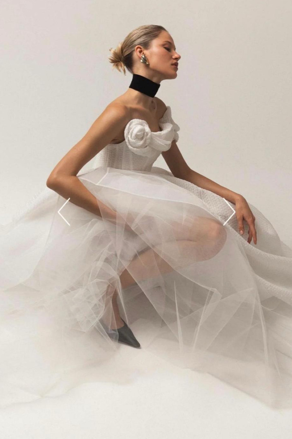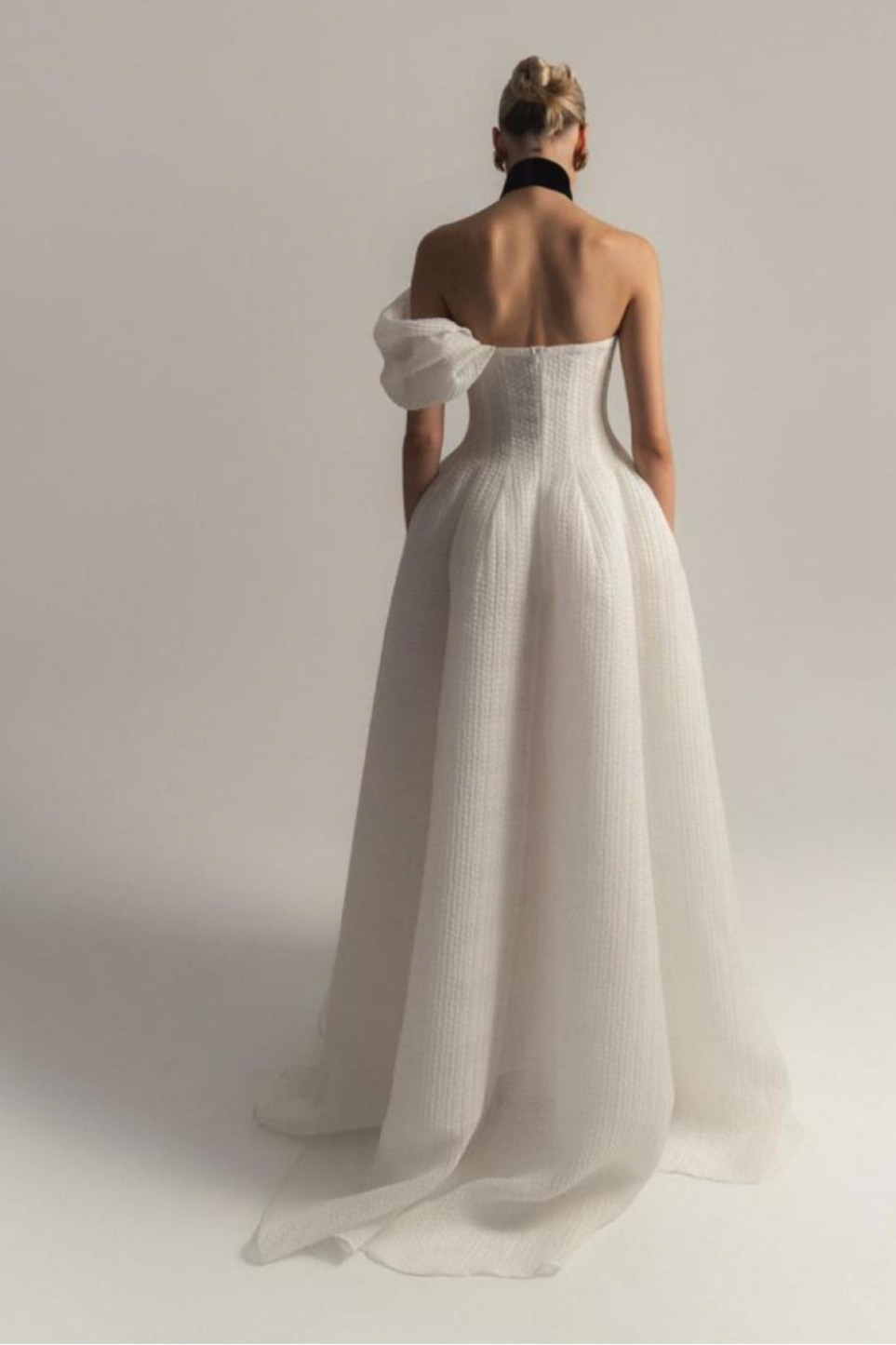 Korse model tek omuz göğüs bölümü çiçek motifli gelinlik