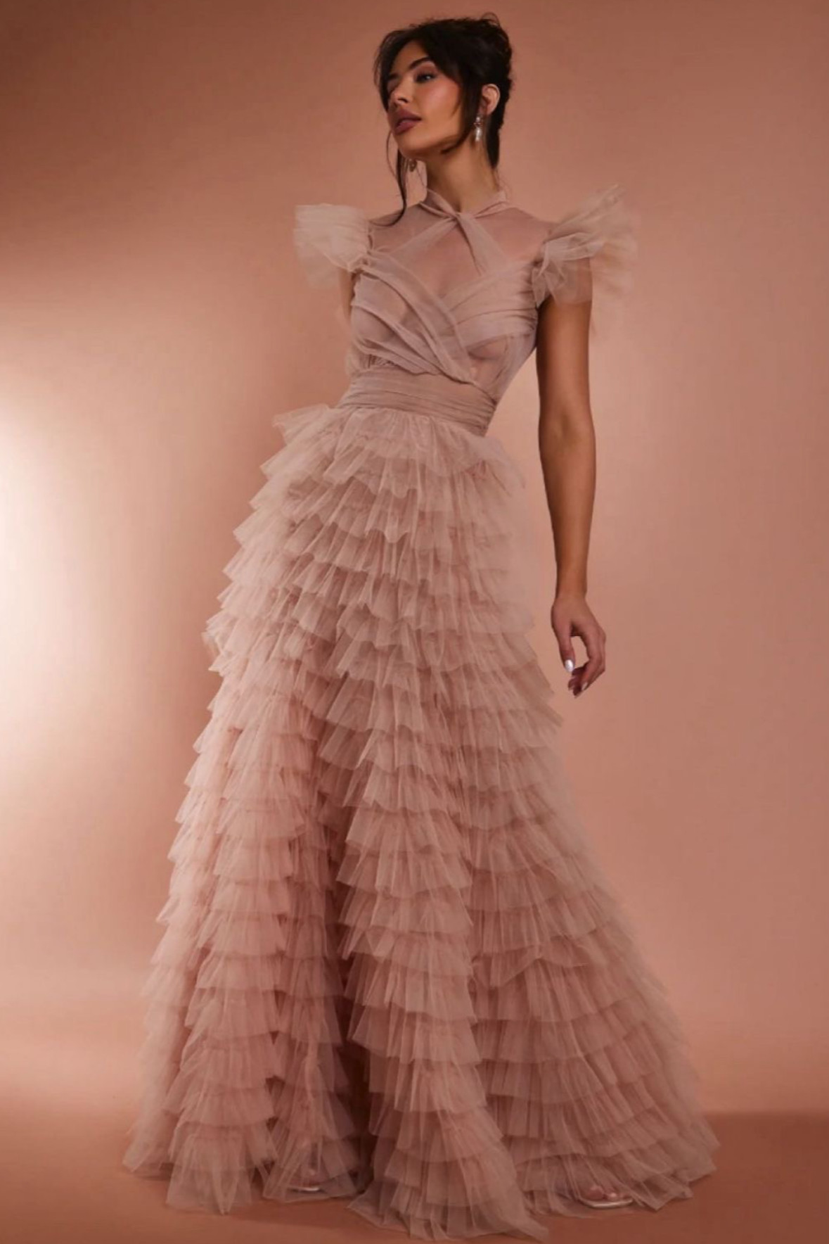 Ön bölümü çapraz gelen tül etekleri kat kat olan uzun elbise