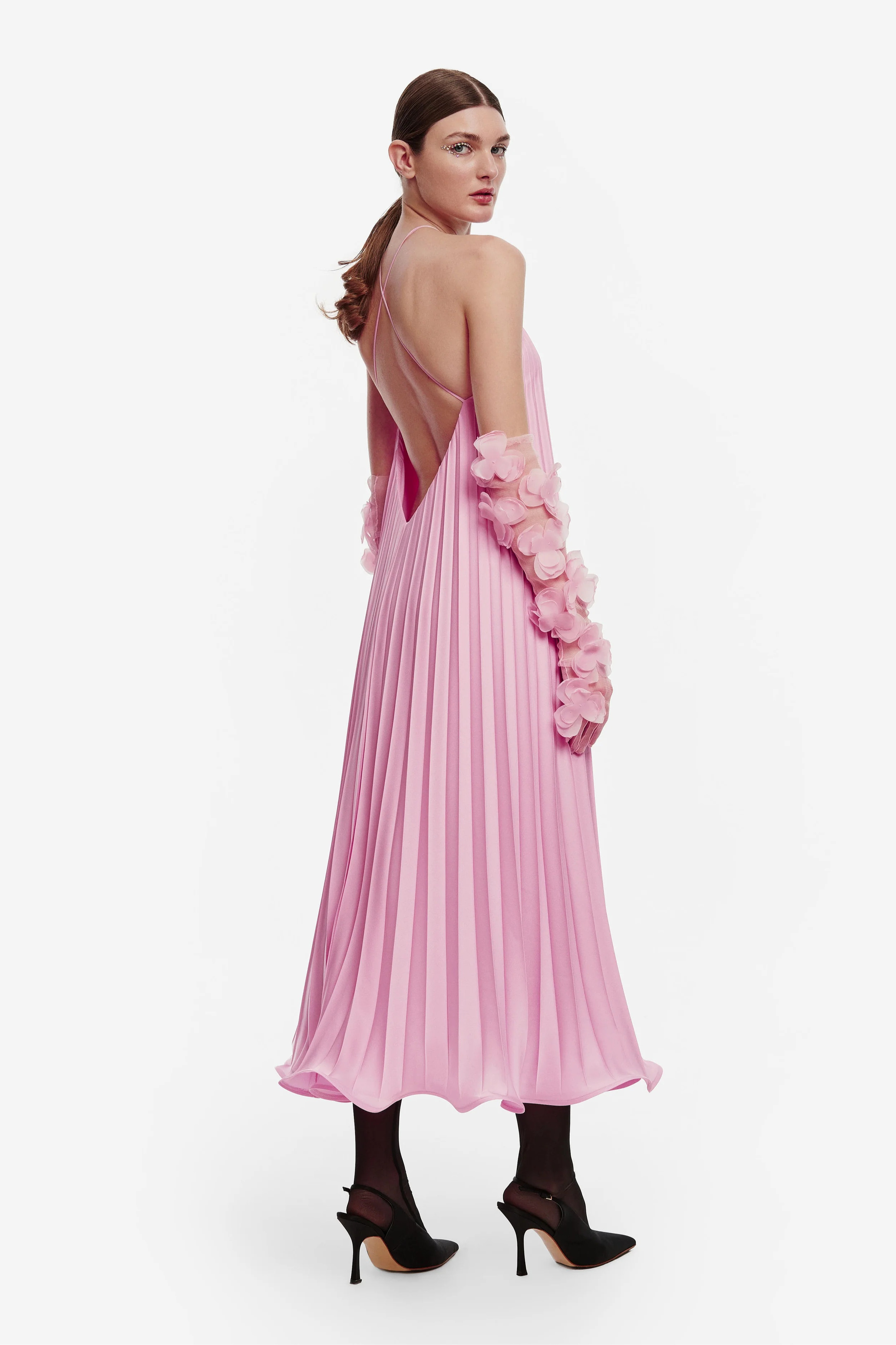 Açık sırtta zarifçe çaprazlanan ince omuz askılı midi slip elbise, etek ucunda fırfırlı ve hareketli bir görünüm yaratan plise satenden yapılmıştır.