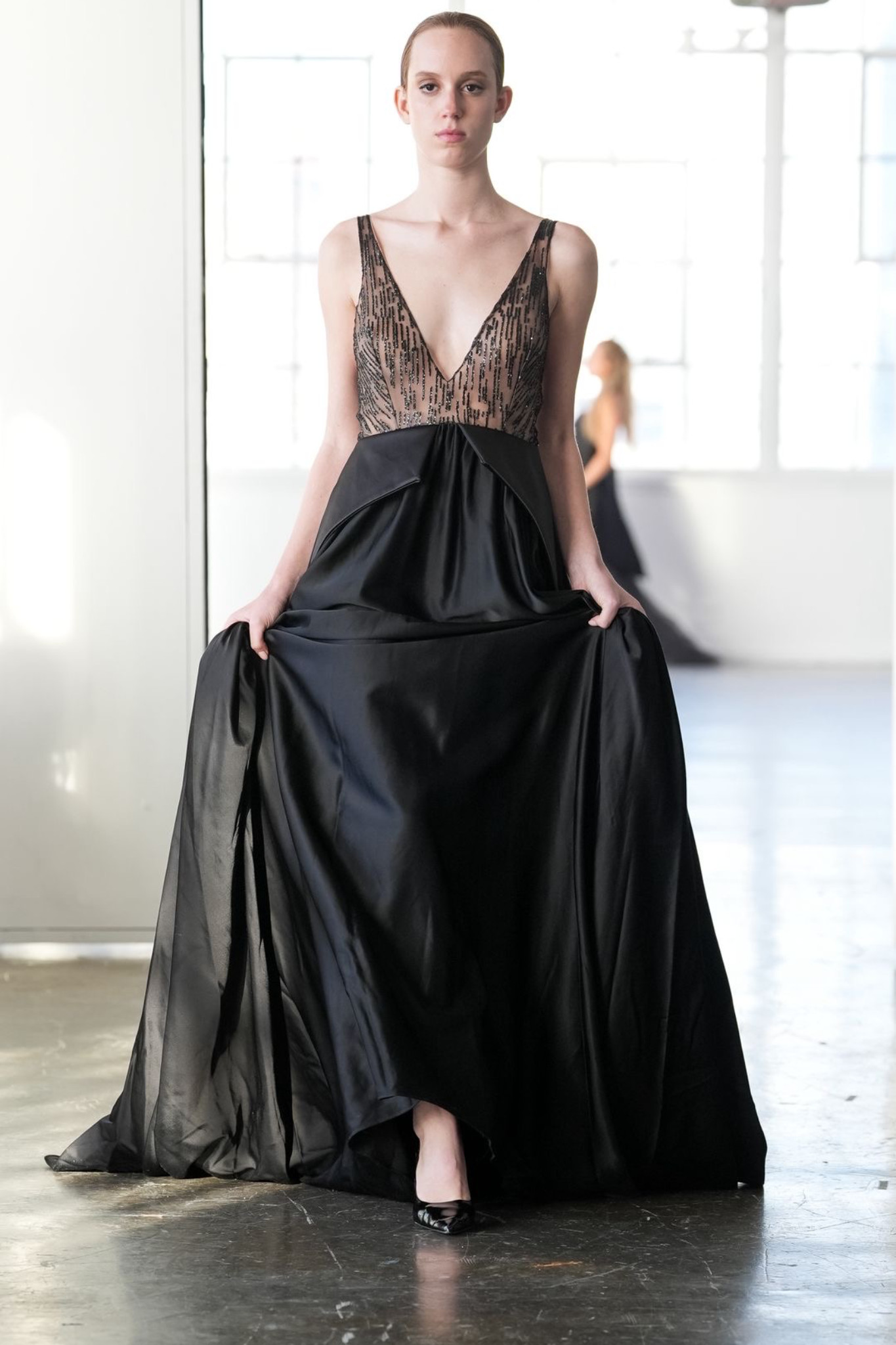 İnce askılı üstü ılıltılı dantel derin göğüs ve sırt dekolteli kuyruklu uzun elbise