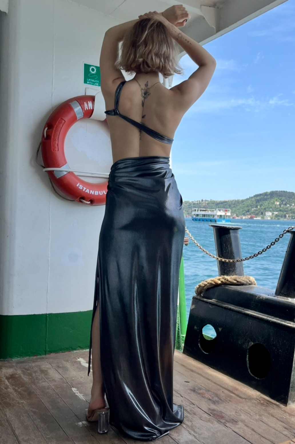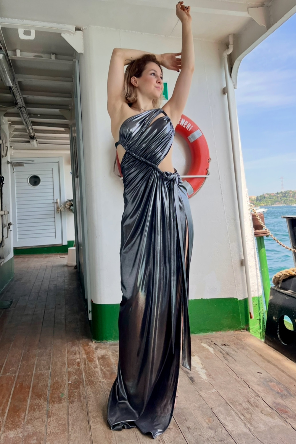 Tek omuz sırtı açık cut out detaylı yandan bağlamalı drapeli derin yırtmaçlı uzun elbise