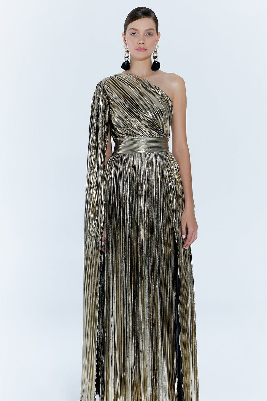 Starr Elbise – Nur Karaata Tasarımı, Sıvama Bronz Kumaş, Tek Omuz Detaylı, Derin Yırtmaçlı: