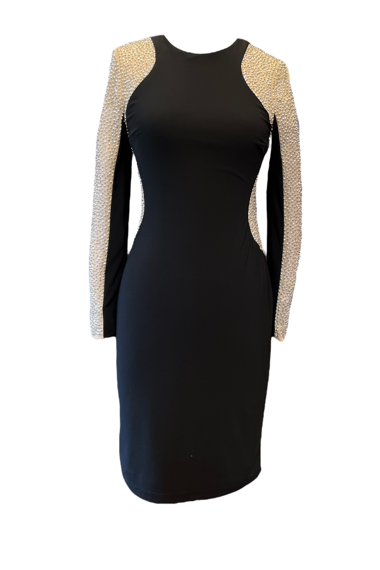 Jarse kolları ve yan bel bölgesi tül üstüne tas detaylı elbise