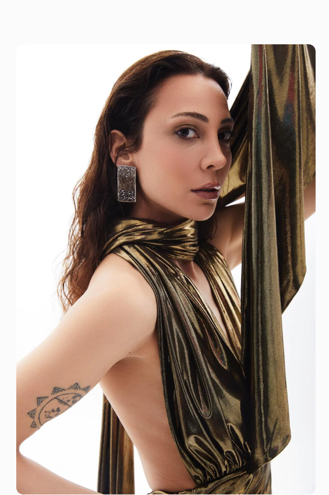 Derin göğüs dekolteli boyundan bağlamalı sırtı açık etek kısmı drapeli mini elbise. Boyundan bağlama kısmı ile birbirlerinden farklı şekillerde kullanılabilir. Esnek kumaştır.