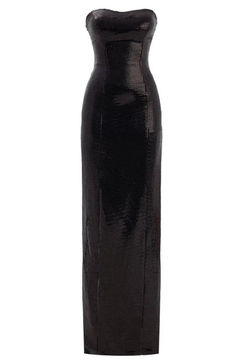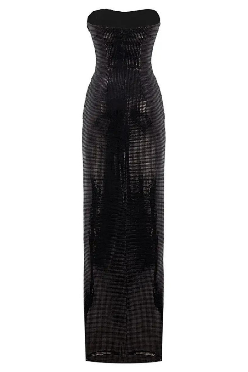 Kolsuz, straplez, payetli kumaştan, yandan yırtmaçlı gece elbisesi.