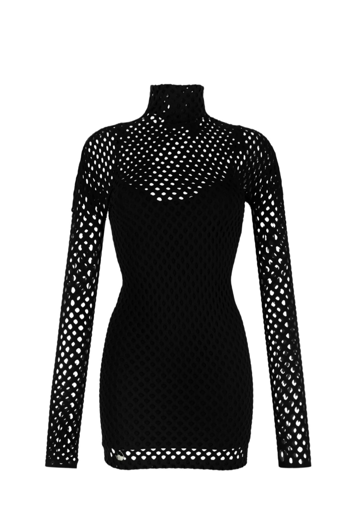 Uzun kol yarım balıkçı yaka mesh delikli mini elbise.