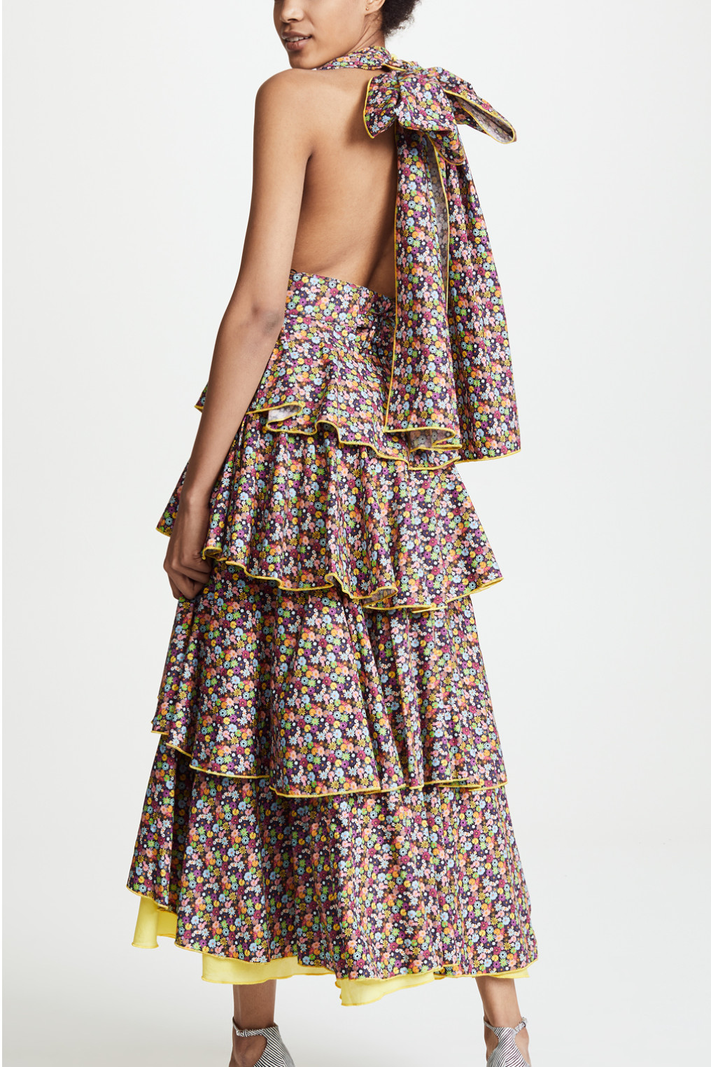 Boyundan bağlamalı çiçek desenli etekleri fırfırlı bilek boy elbise