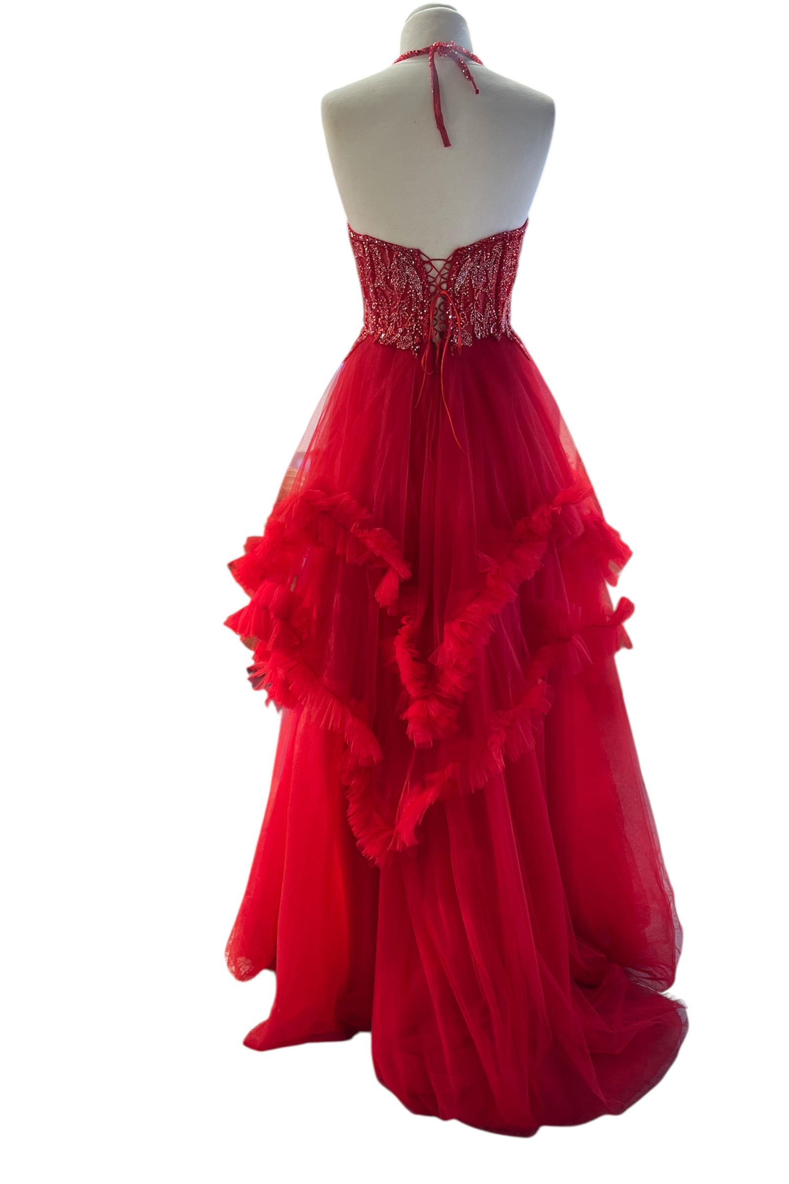 Gözl alıcı kırmızı tonuyla dikkat çeken bu özel elbise, halter yaka ve boyundan bağlamalı formuyla zarif bir duruş sunuyor. Üst kısmındaki kristal boncuk işlemeler, ışık altında büyüleyici bir ışıltı yaratırken prenses model kabarık tül eteği ve asimetrik fırfır detayları elbiseye masalsı bir hava katıyor.