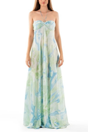 Romantik tonların zarif bir dansı… Callirrhoe imzalı bu straplez elbise, hafif şifon dokusu ve açık mavi ile sarının yumuşak uyumunu yansıtan desen baskısıyla adeta yaz rüzgarını giydiriyor. Uçuş uçuş silueti, her adımda hafiflik ve zarafet sunarken; straplez kesimi omuzları öne çıkararak feminen bir çekicilik katıyor. Düğün davetlerinden sahil kokteyllerine, yaz akşamlarının tüm özel anlarında hem kiralayabilir hem de satın alabilirsiniz.