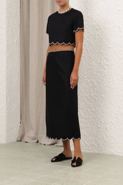Günün her anına zarafet katan bir tercihle tanışın: Zimmermann Crush Scalloped Midi Etek, %100 keten kumaşıyla hem nefes alıyor hem de hafif dokusuyla sıcak havalara hitap ediyor. Bel hizasındaki pileli kalem silueti, asaletle bedenle bütünleşirken, bel ve etek ucundaki kristal süslemeli kıvrımlı (scalloped) detaylar, sade bir etekten çok, bir stil ifadesine dönüşüyor. Gizli arka fermuar ve uzun boyu ile rahat kombinasyonlara imkan tanıyan bu etek, stile şıklık katan dokunuşuyla öne çıkıyor .