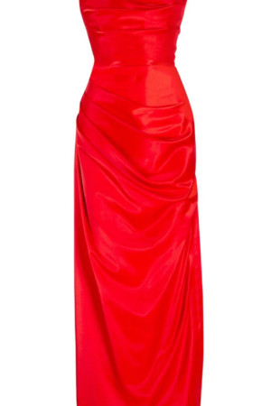 Staplez göğüs bölümü drapeli kırmızı uzun ve yandan yırtmaçlı elbise
