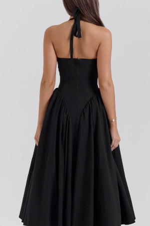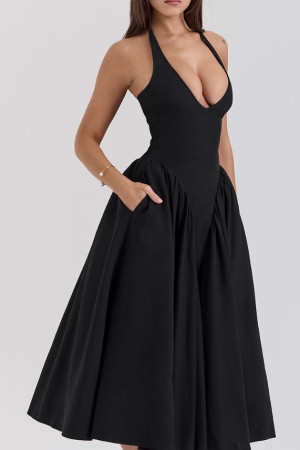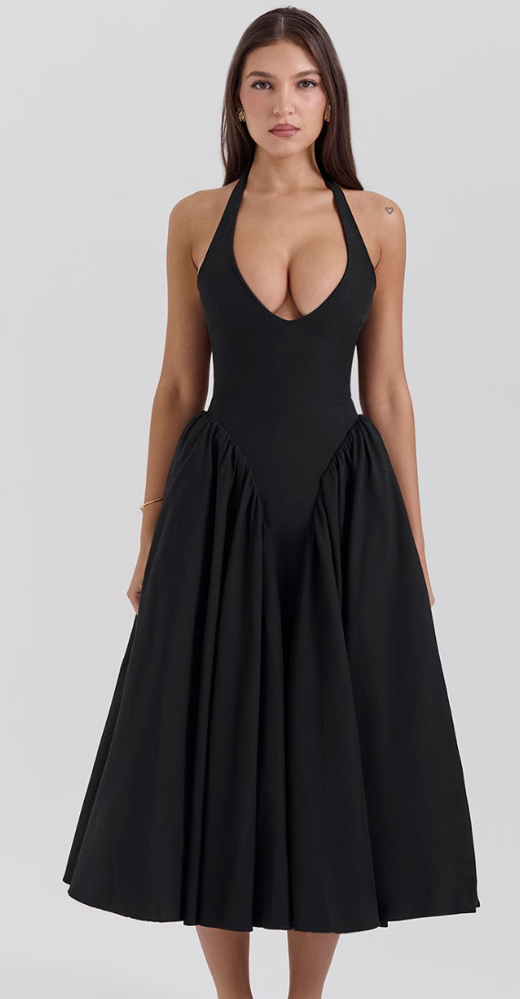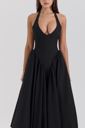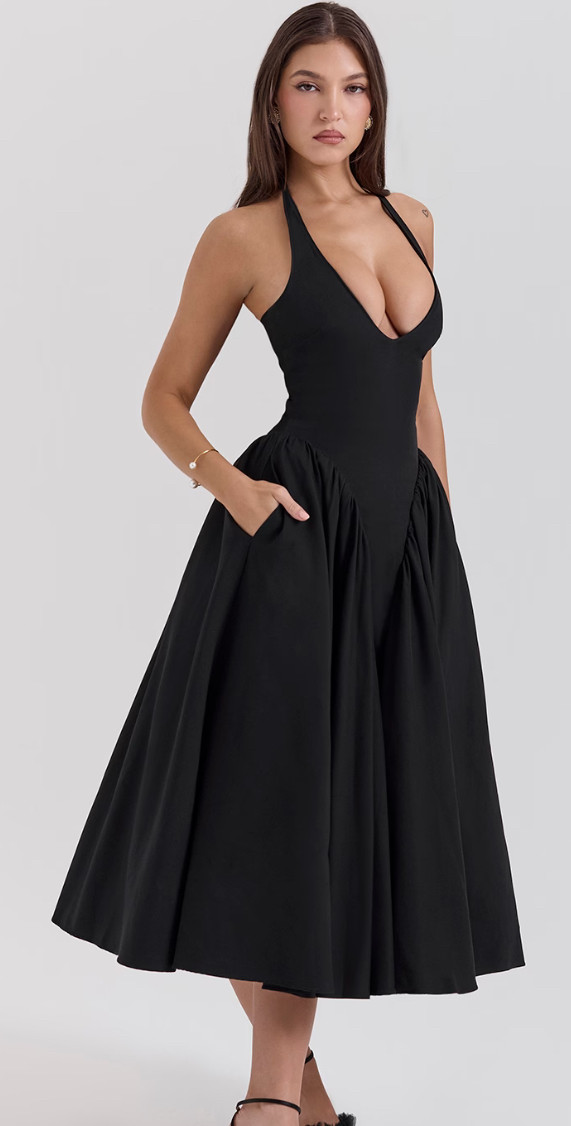 Derin v yaka beli korse model alt bölümü kabarık midi elbise