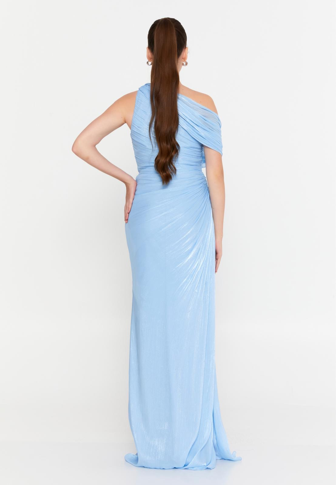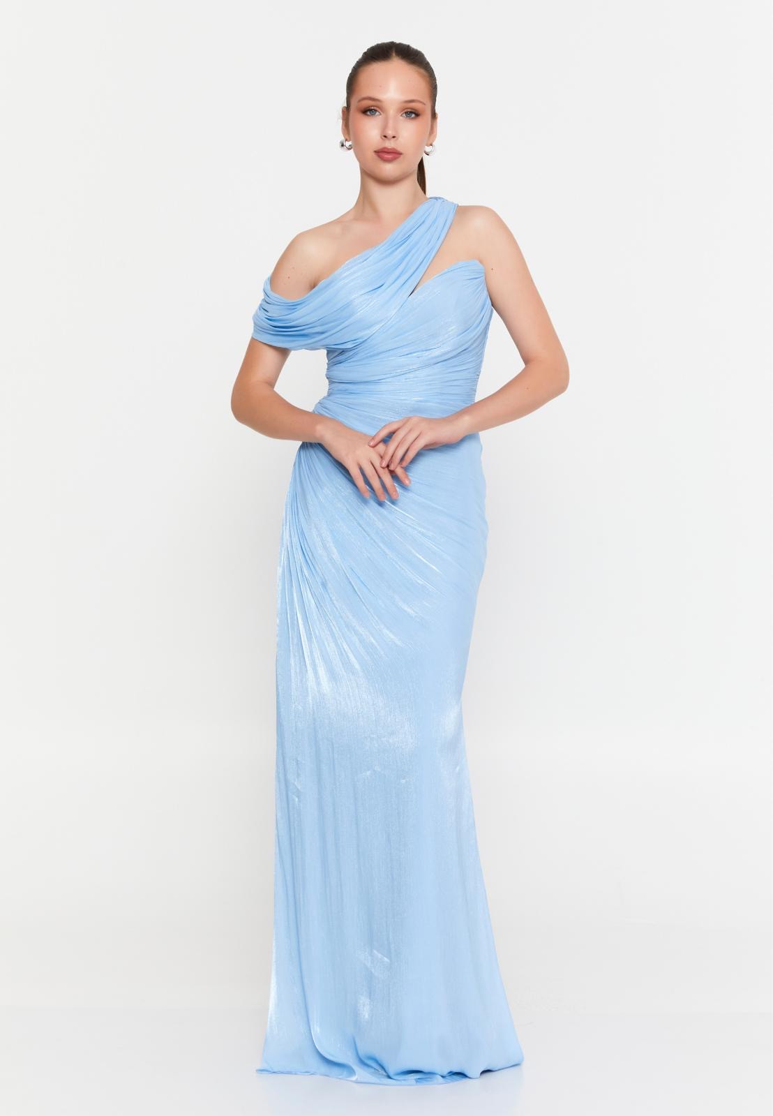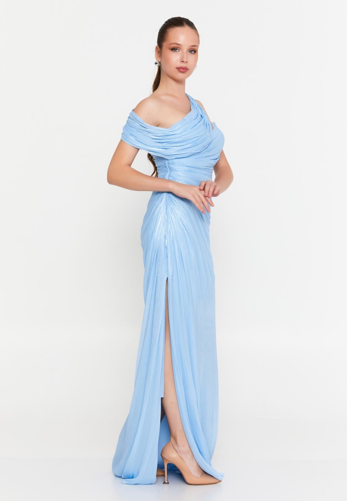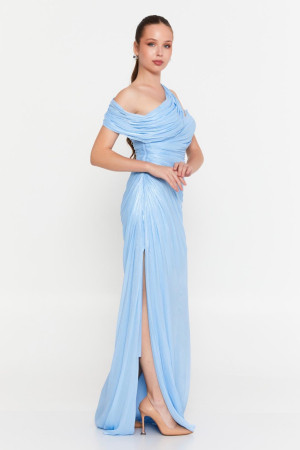 Üst bölümü Straplez düşük omuz ve kendinden drapeli elbise