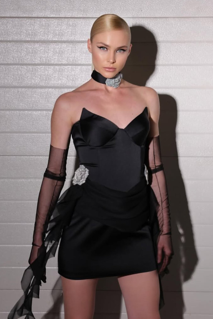Straplez korse model yanları gümüş çiçek motifli bel kısmında uzun fırfır detaylı