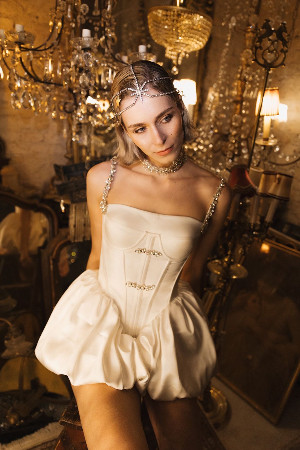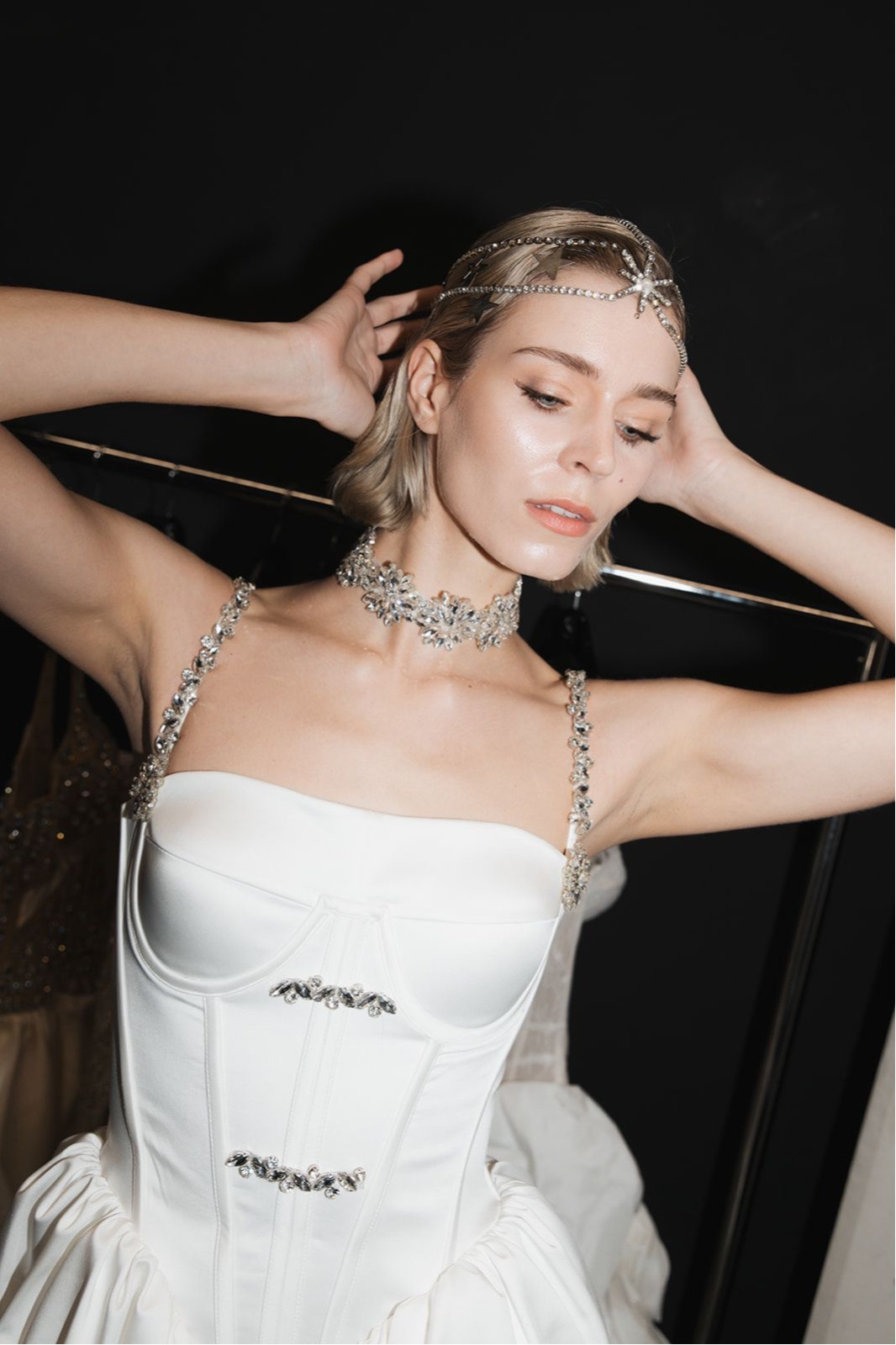 Vücut formunu zarifçe kavrayan korse üst, kusursuz bir silüet yaratırken, işleme detayları elbiseye hem romantik hem de güçlü bir duruş katıyor. Balon etek ise bridal stiline genç, dinamik ve moda haftası ilhamlı bir yorum kazandırıyor.