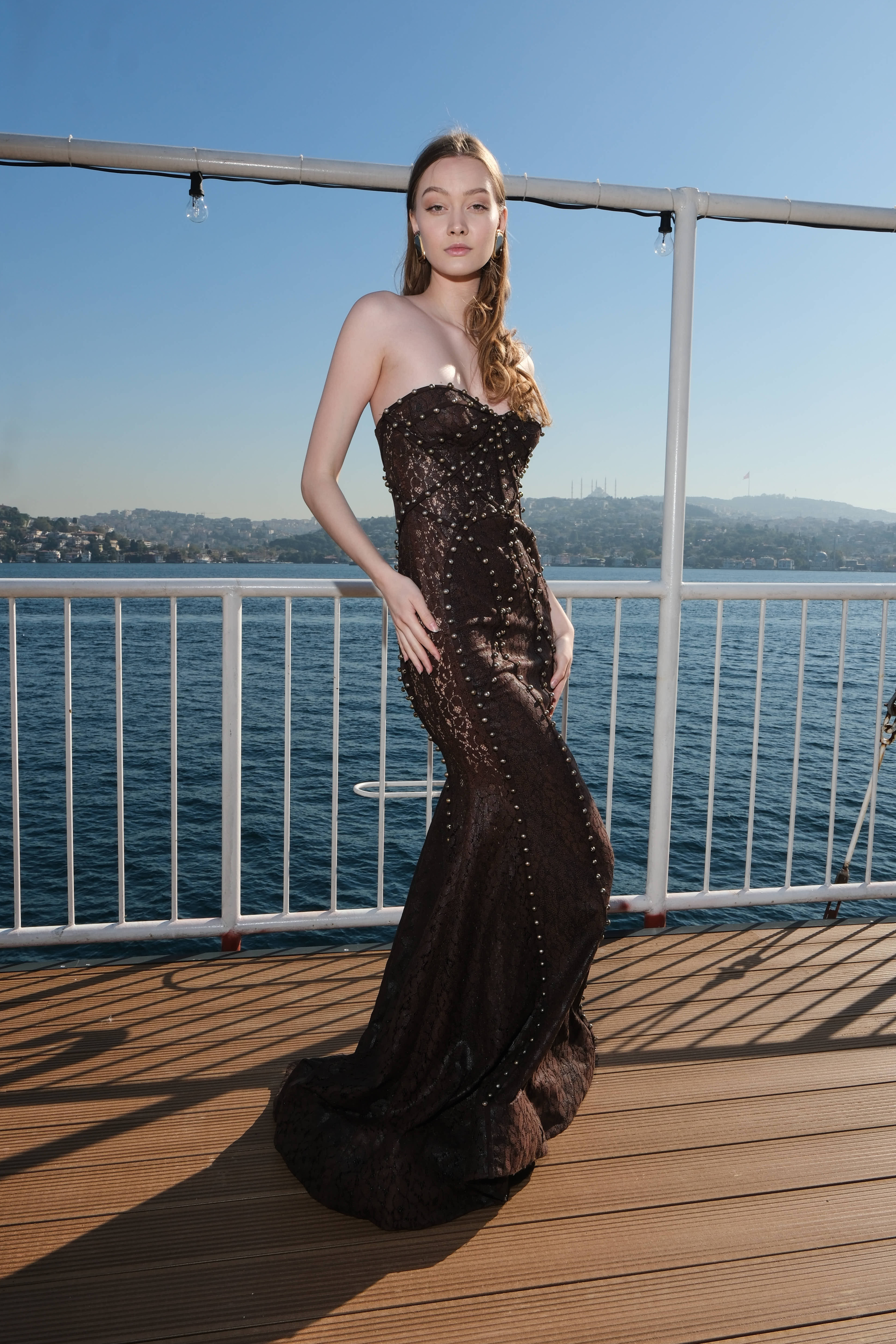 Dilber Günel tasarımı bu kahverengi straplez uzun elbise, dantel dokusu üzerine yerleştirilen metal zımba detayları ile güçlü, modern ve karakter sahibi bir siluet yaratıyor. Gövdeyi kusursuz saran kalıbı, noktadan çizgiye uzanan zımba yerleşimleri sayesinde heykelsi bir form ve benzersiz bir couture duruşu sunuyor.