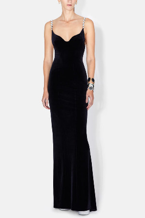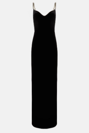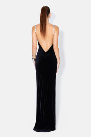 Galvan London Avedon Globe elbise, minimal tasarım ile çarpıcı detayları kusursuz şekilde bir araya getiriyor. Vücuda oturan uzun silüeti ve yumuşak kadife dokusu, zamansız bir şıklık sunarken; omuzlardaki ışıltılı globe askı detayları görünümü modern ve dikkat çekici bir seviyeye taşır.
