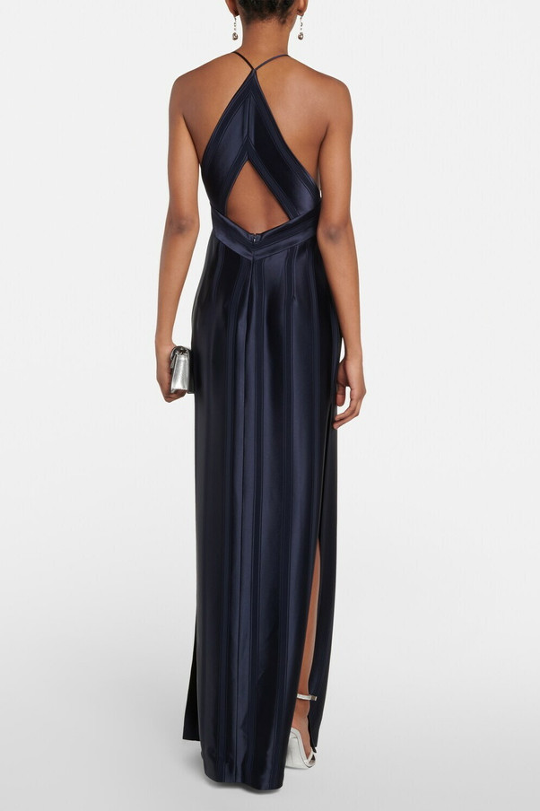 Galvan London imzalı bu lacivert saten maxi elbise, modern davet stilini güçlü bir silüetle buluşturuyor. Işıltılı çizgili saten dokusu, vücut hatlarını zarifçe sararken; derin V yaka, ön ve arka cut-out detayları ve cesur yırtmaç ile feminen ve iddialı bir görünüm yaratır.