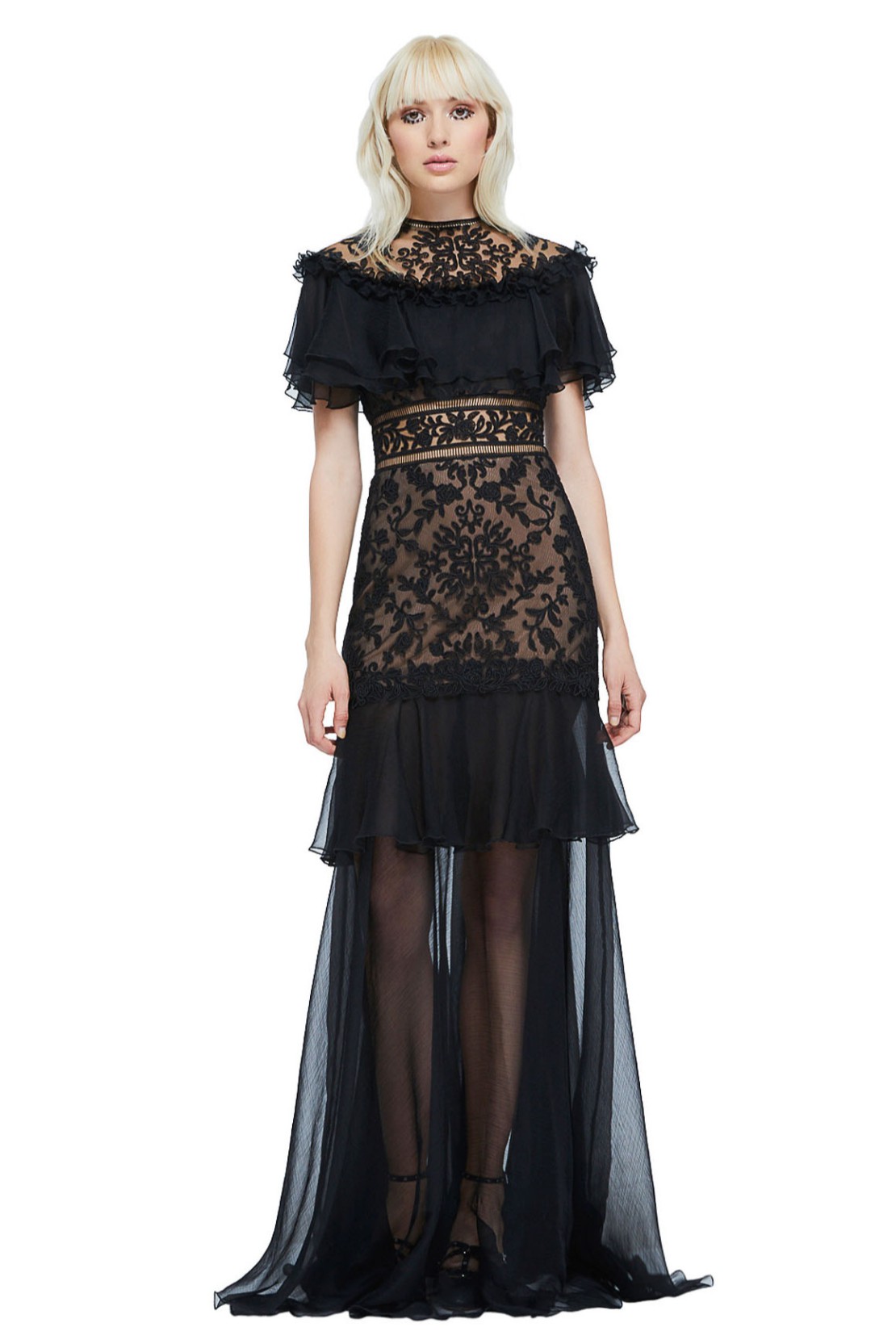 Kayık Yaka Göğsü Dantelli ve Şifon Volanlı Etekleri Şifon İnen Uzun Gece Elbisesi