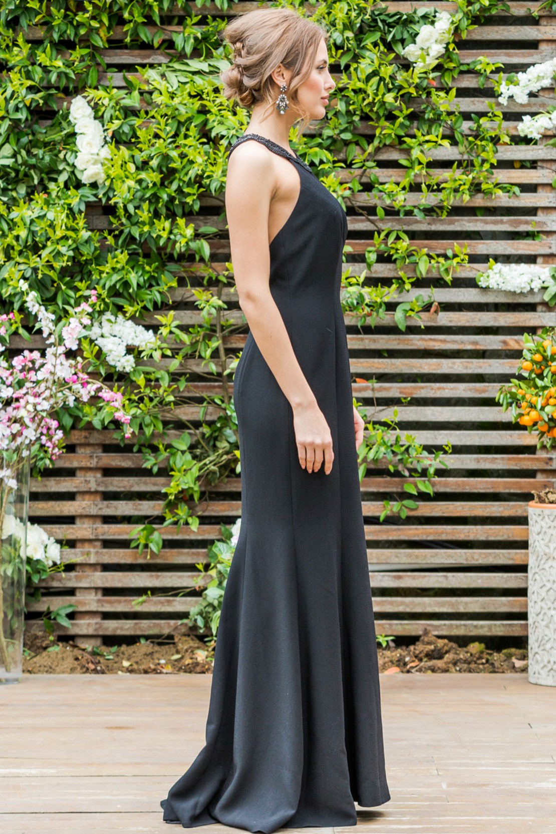 Halter yaka boyunda ve sırtta boncuk işlemeli balık kesim gece elbisesi
