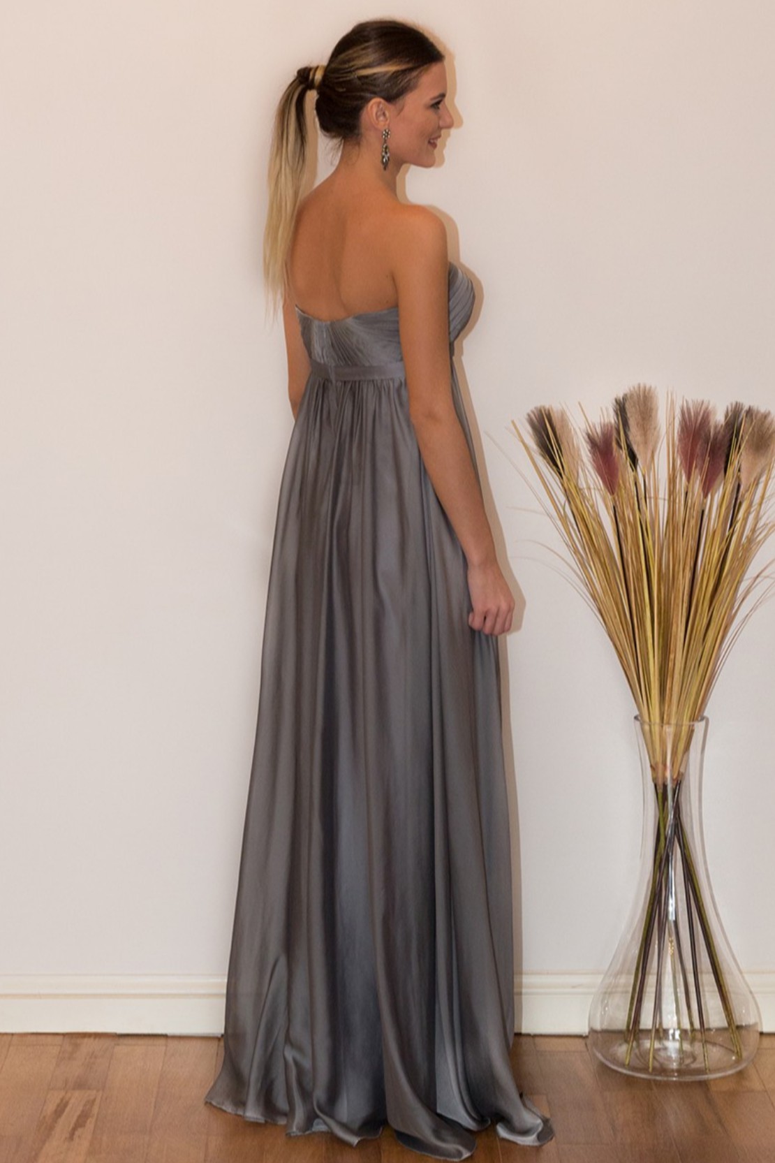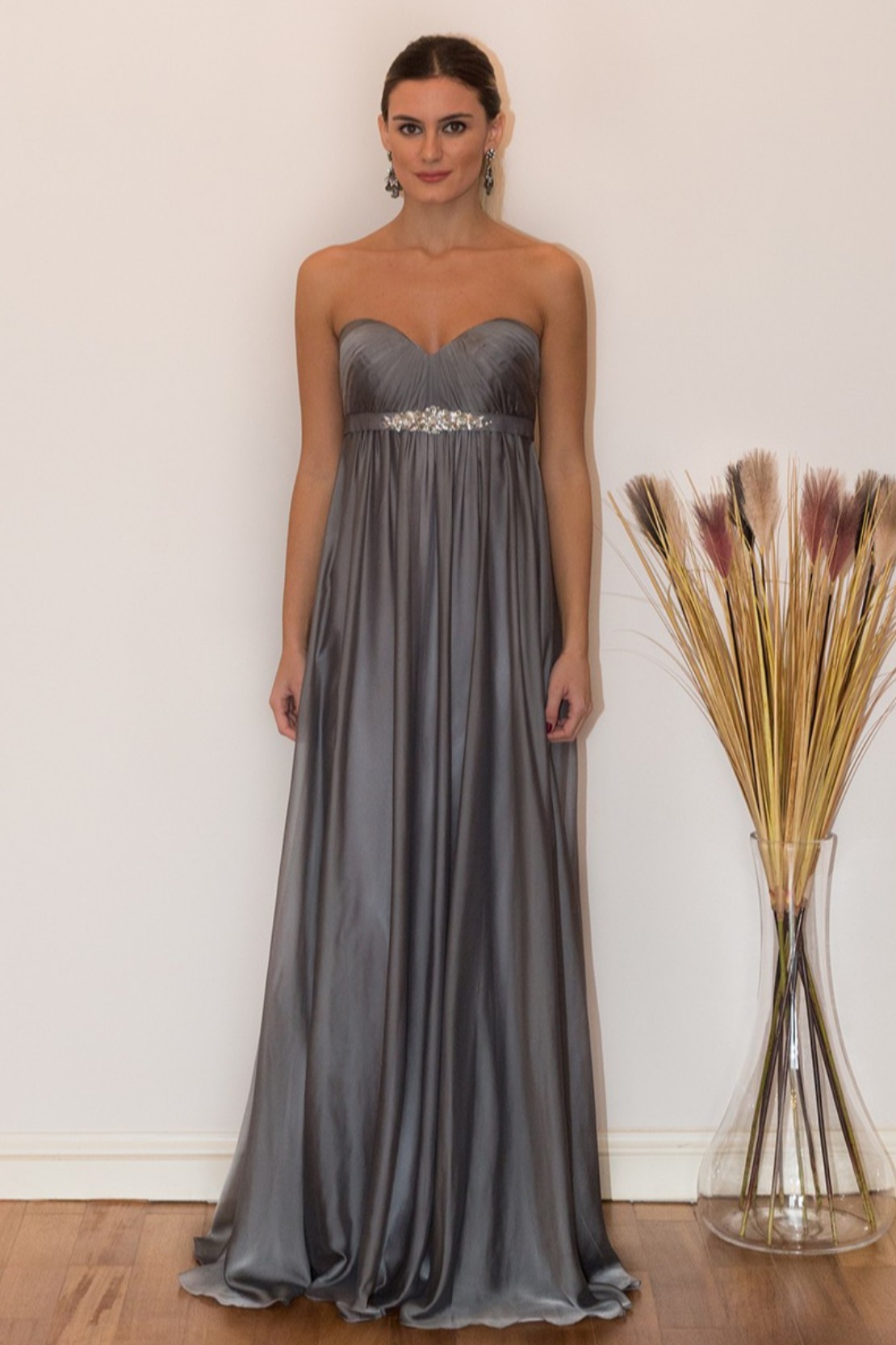 Straplez ipek şifon robadan kesim göğüs kısmında taş işlemeli kloş gece elbisesi