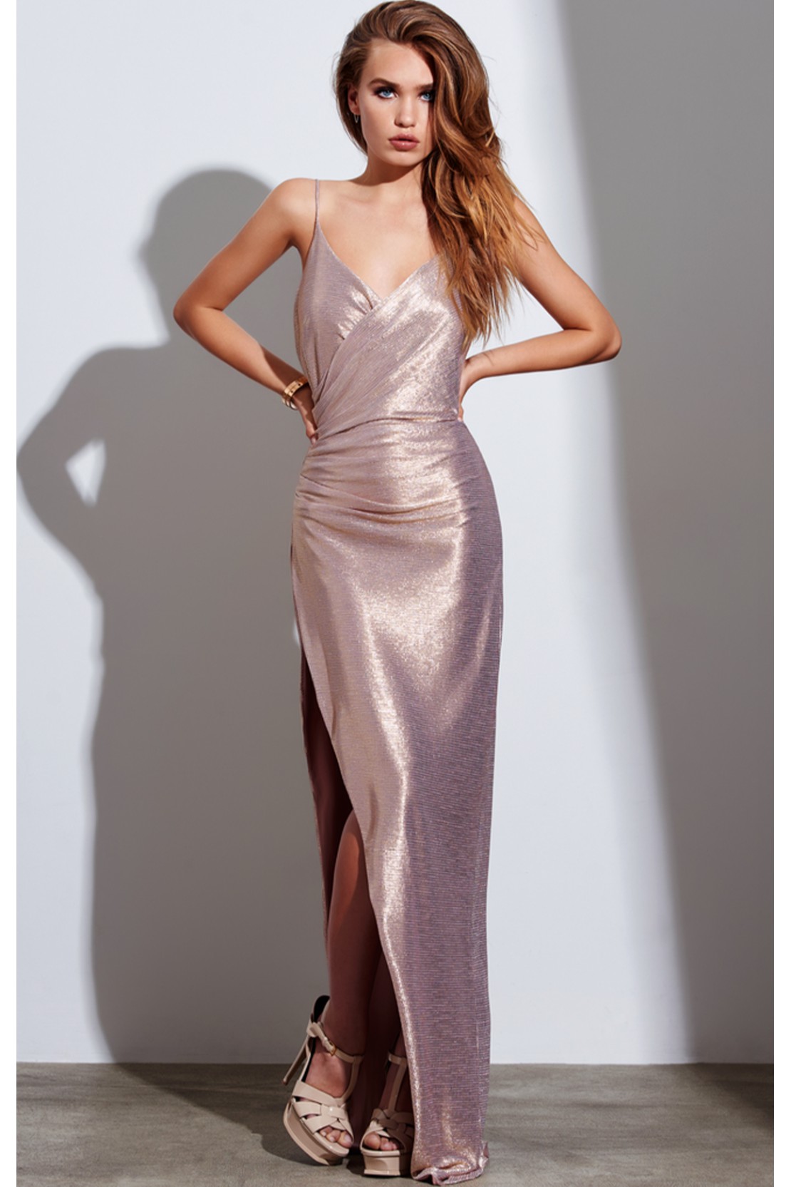 Derin V Yaka Degaje Sırt Dekolteli Yandan Yırtmaçlı Kendinden Simli Gece Elbisesi