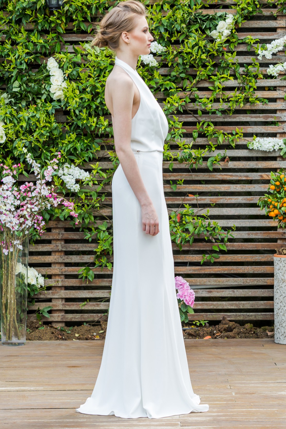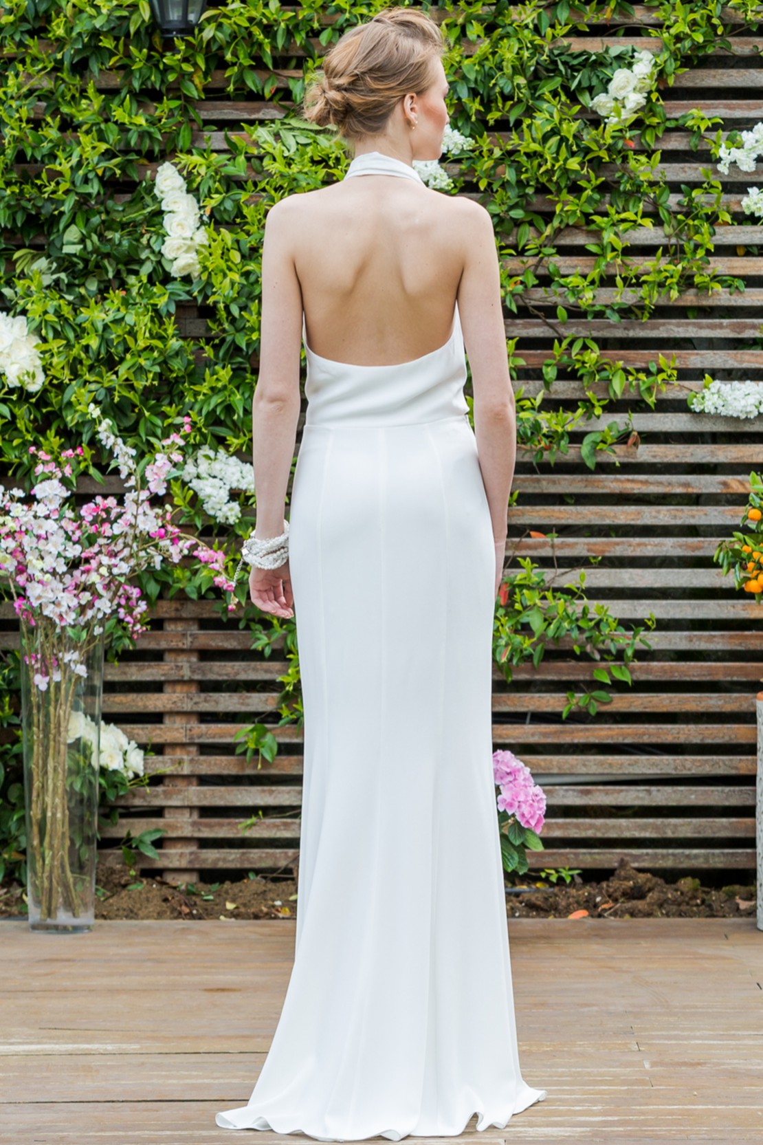 Halter yaka boyundan bağlamalı önden derin yırtmaçlı sırtı açık bel kısmında çiçek motitli uzun elbise
