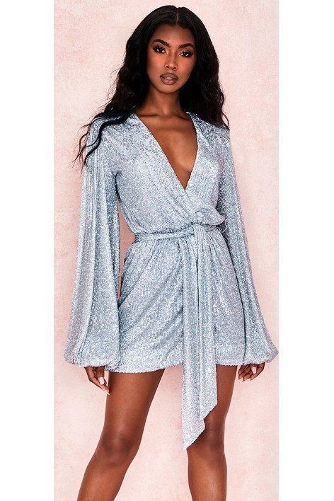 Envelop kapanan derin göğüs dekolteli kendinden payetli kumaş beli kemerli balon kollu içi ful astarlı mini gece elbisesi
