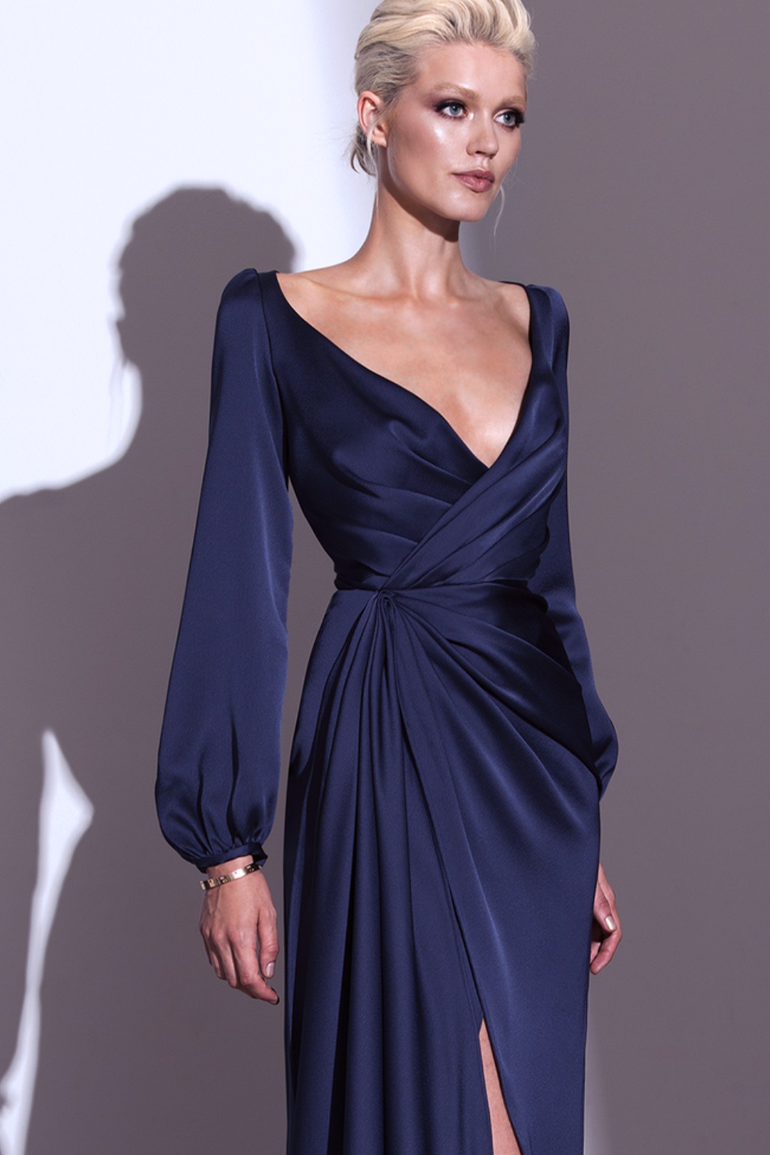 Derin Göğüs ve Bacak Dekolteli Uzun Kollu İpek Saten Gece Elbisesi