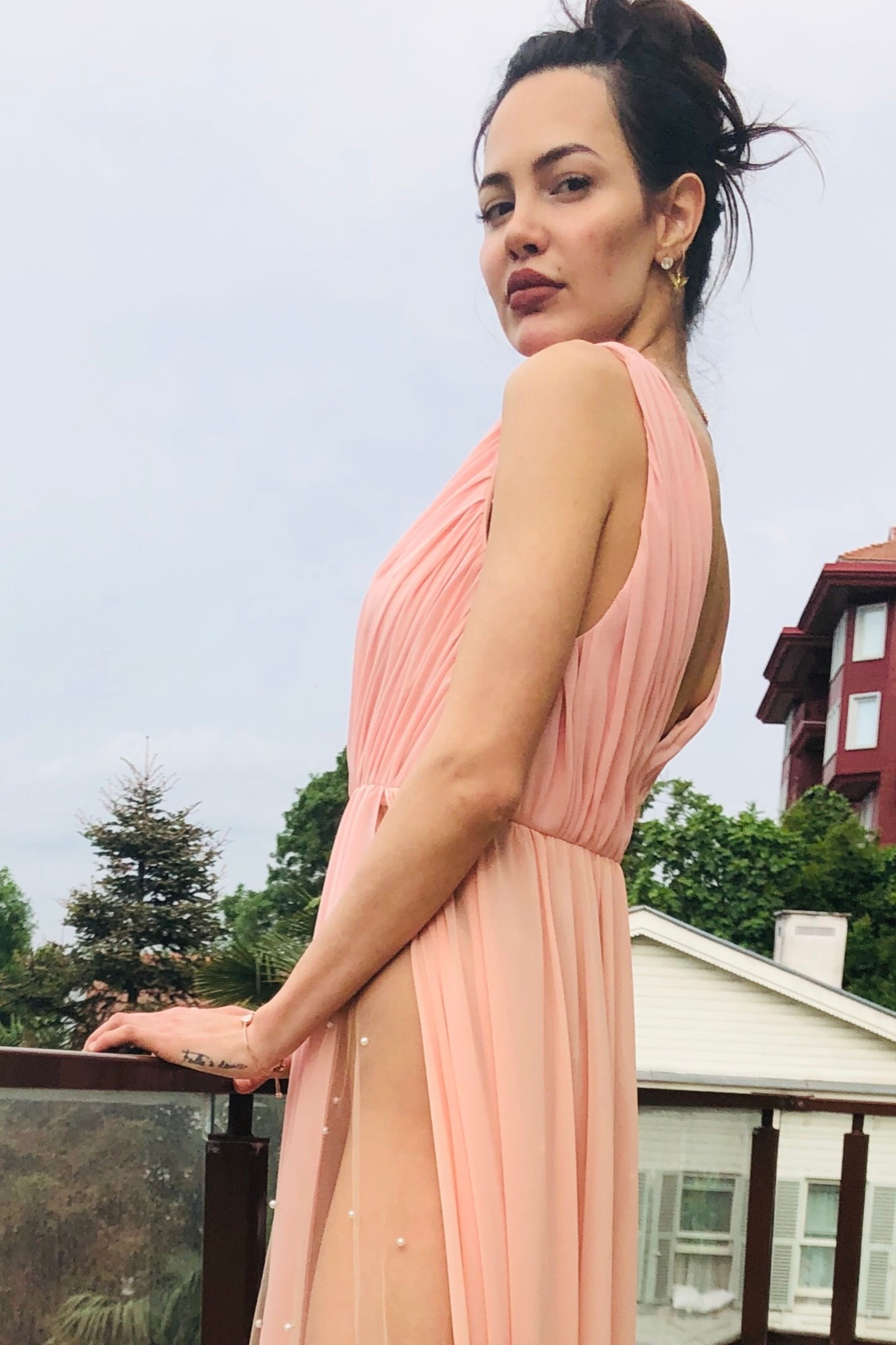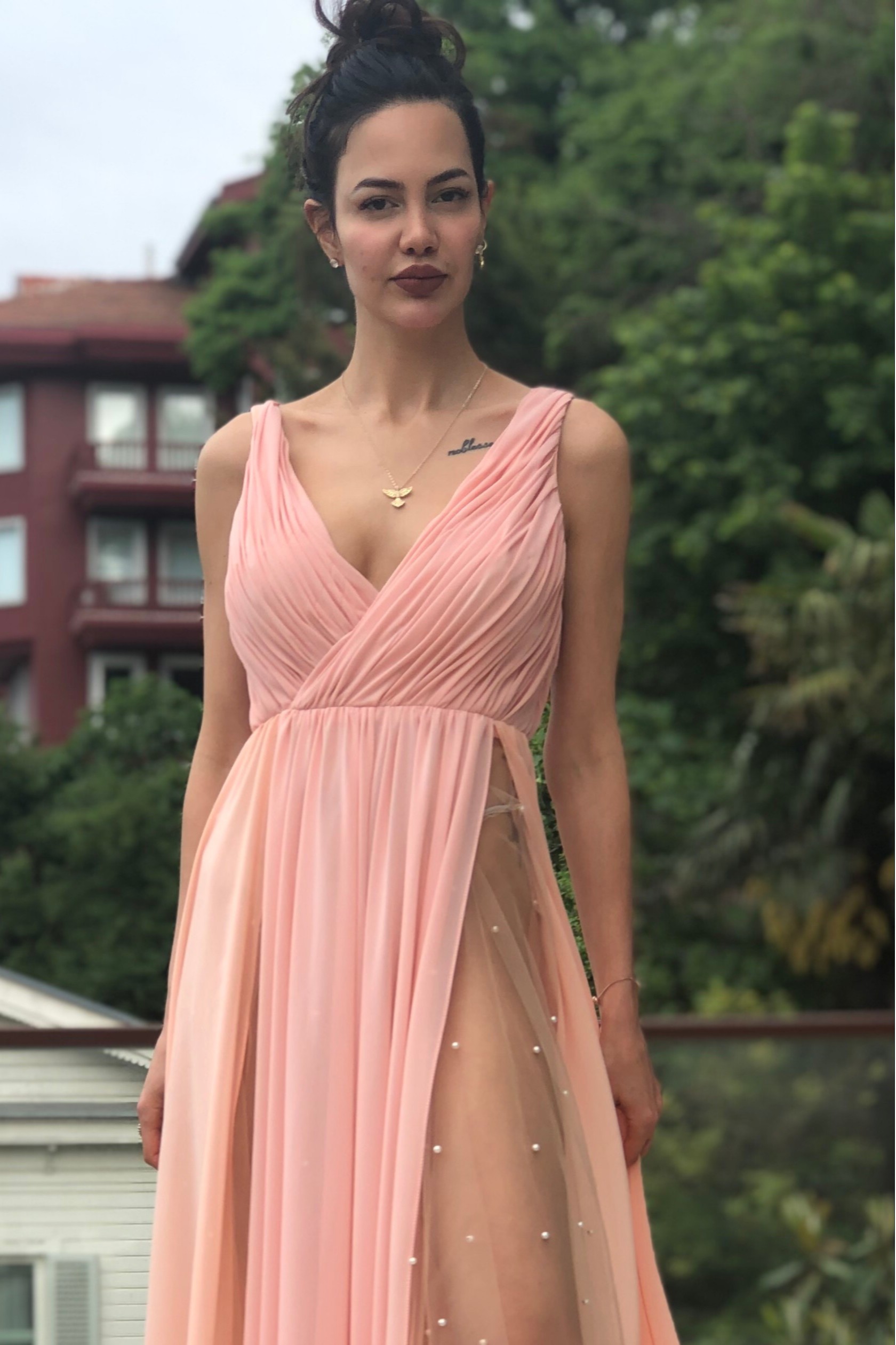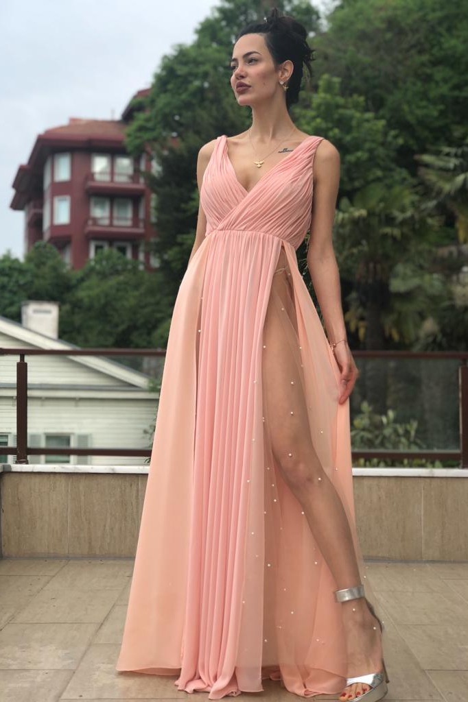 Göğüs ve Sırt Drapeli ve Derin Dekolteli Etek Kısmı Çift Yırtmaçlı Alt Etekleri Tül Üstüne İnci İşlemeli Şifon Gece Elbisesi