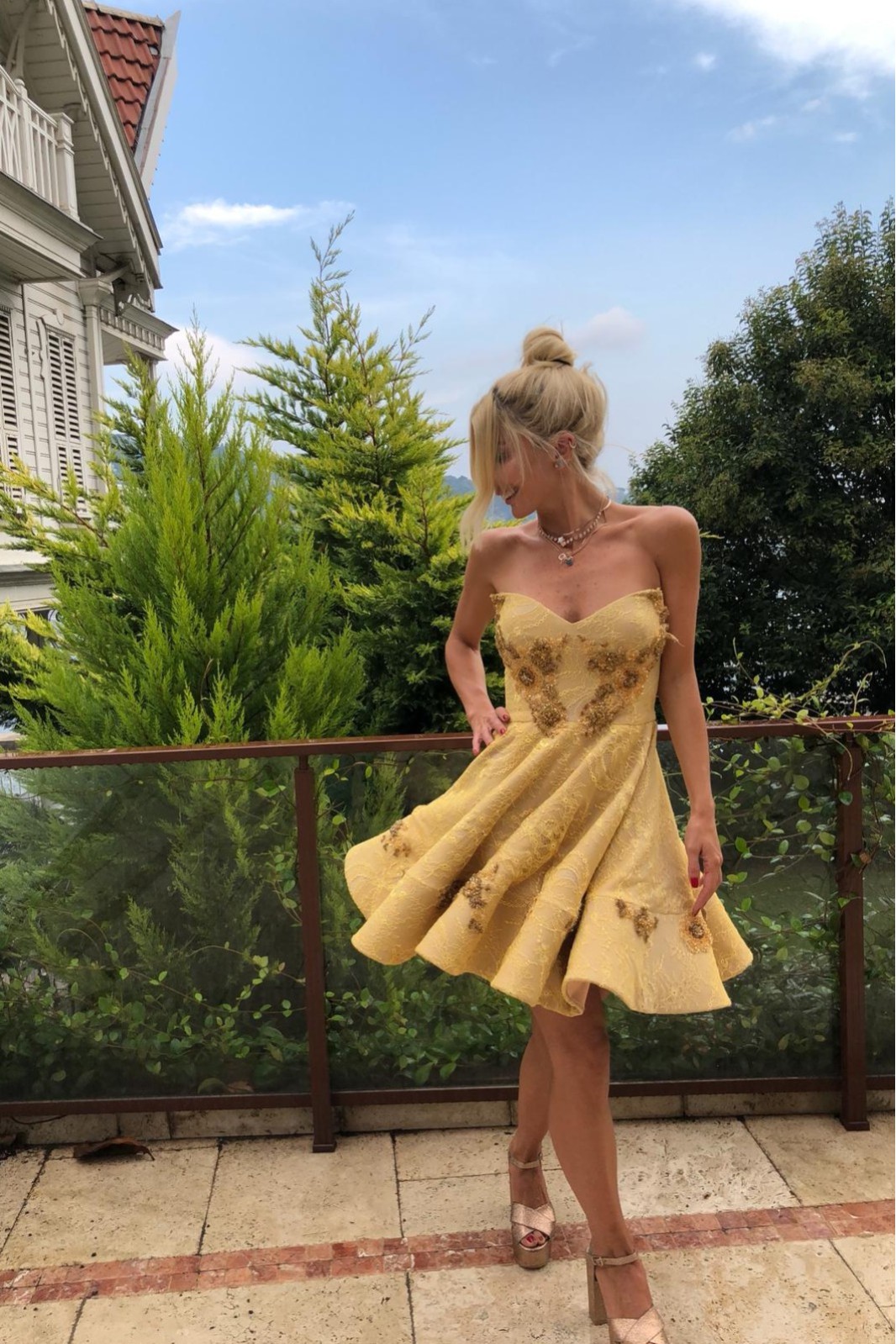 Straplez Göğüs Kısmı İşlemeli Kloş Mini Özel Dikim Gece Elbisesi