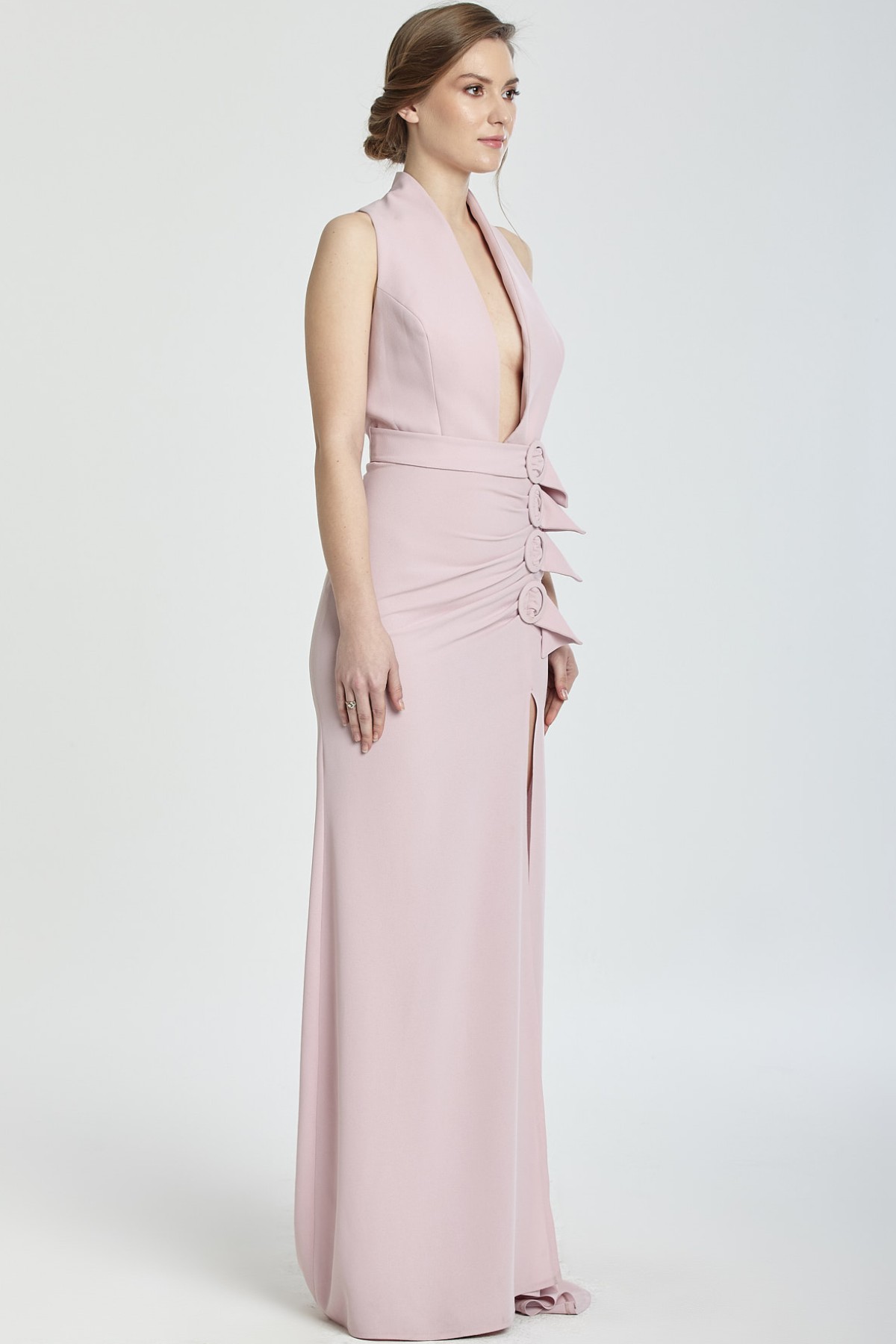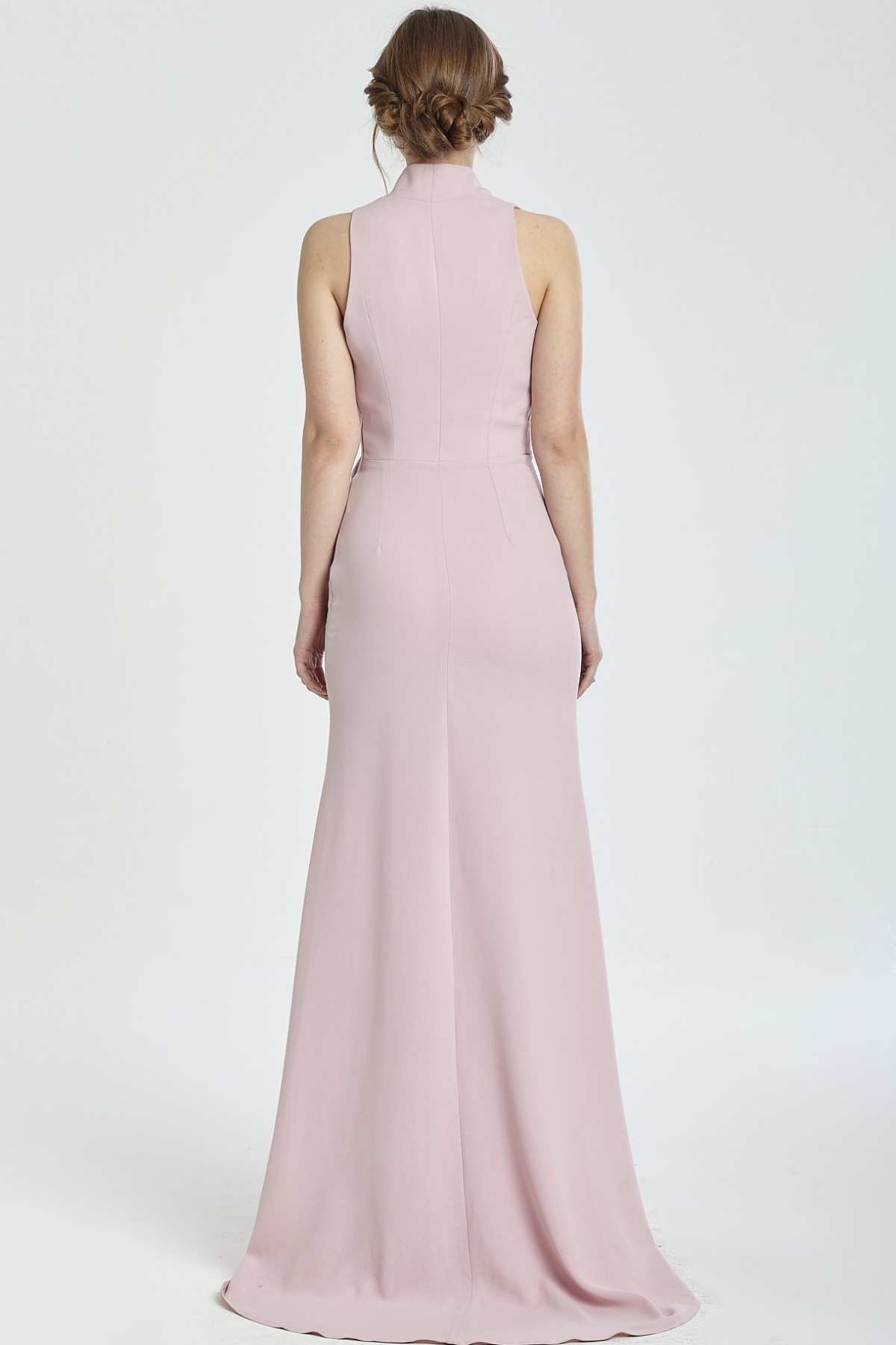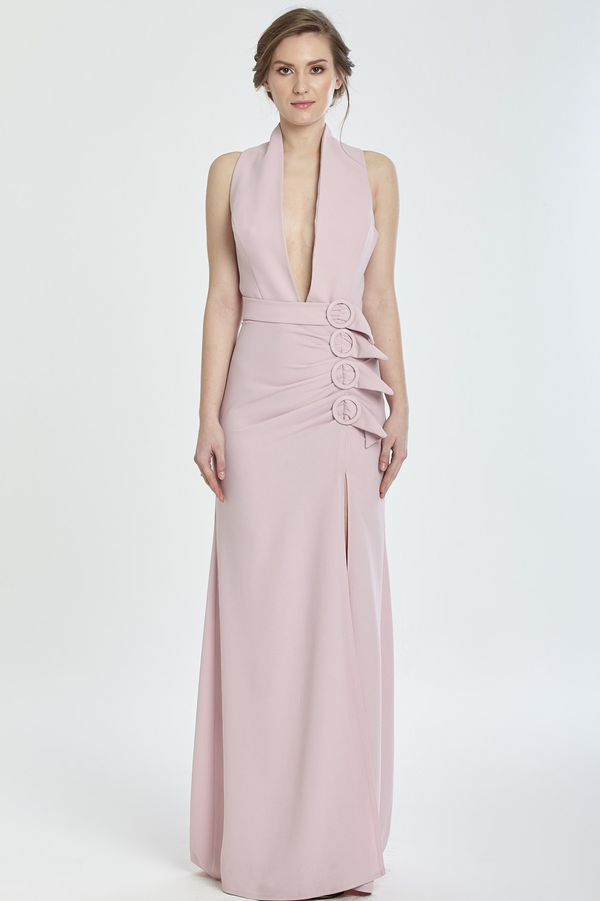 Dik yaka derin göğüs dekolteli bel kısmı drapeli kemer toka detaylı derin yırtmaçlı kuyruklu gece elbisesi