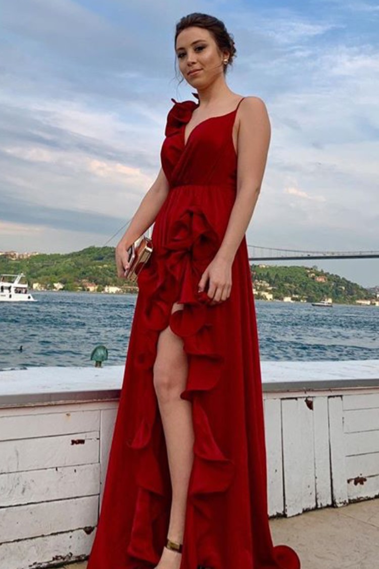 Spagetti askılı derin göğüs ve sırt dekolteli omuzda başlayan ve etek ucuna devam eden fırfır detaylı derin yırtmaçlı uzun gece elbisesi