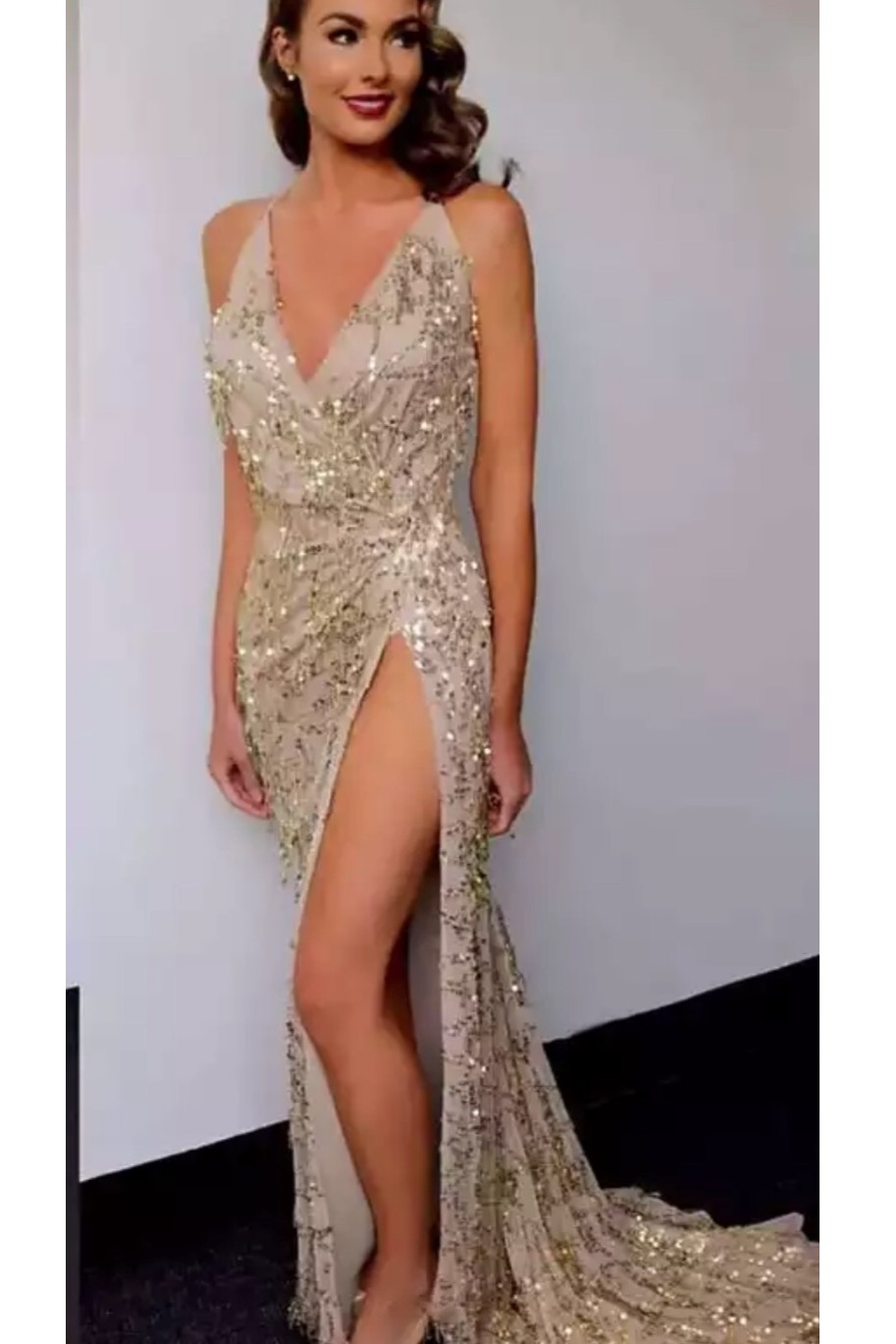 Derin V Yaka Sırtı Açık Püskül Pullu Derin Yırtmaçlı Gece Elbisesi
