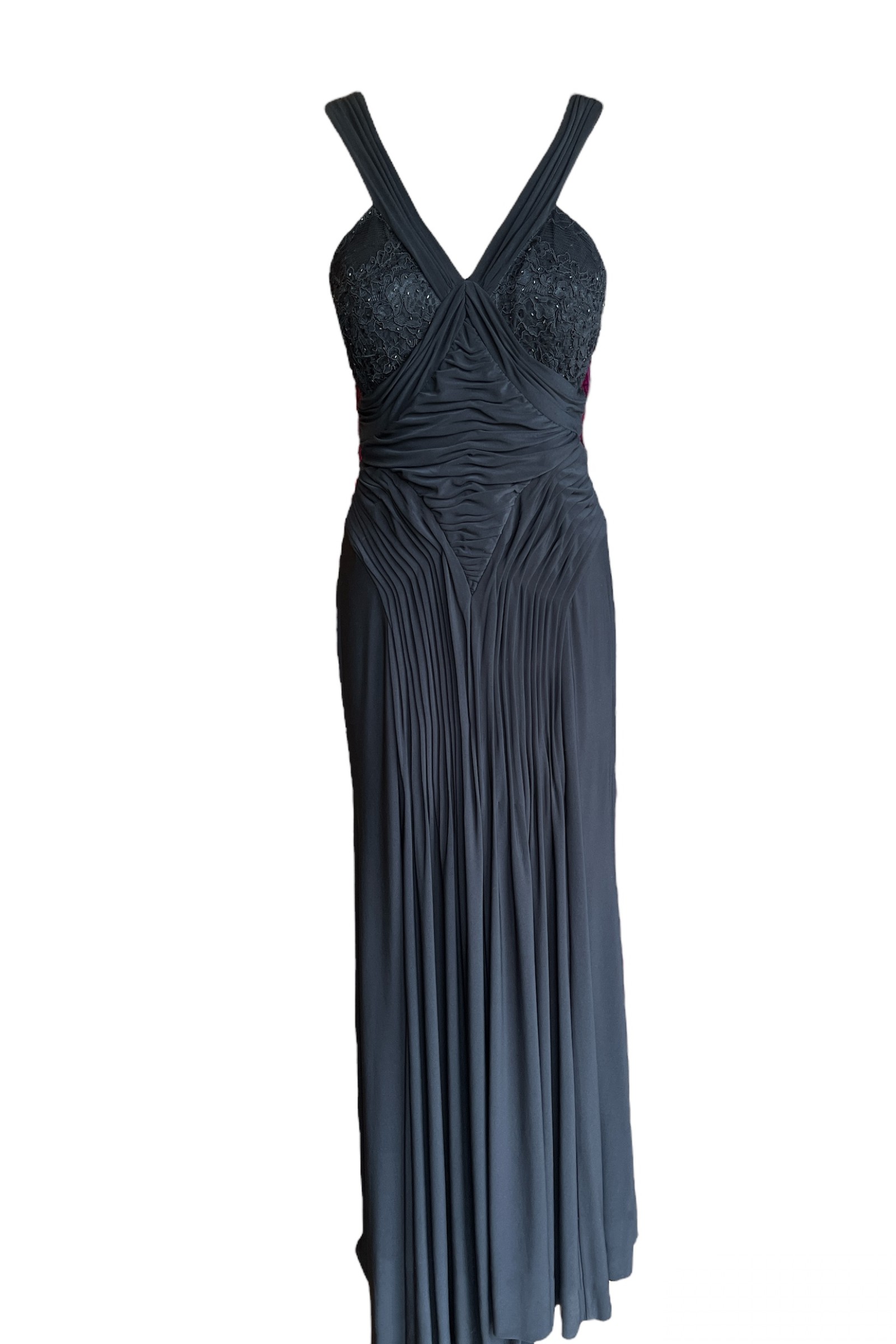 Derin V yaka göğüs kısmı boncuk işlemeli önü drapeli önden yırtmaçlı uzun gece elbisesi