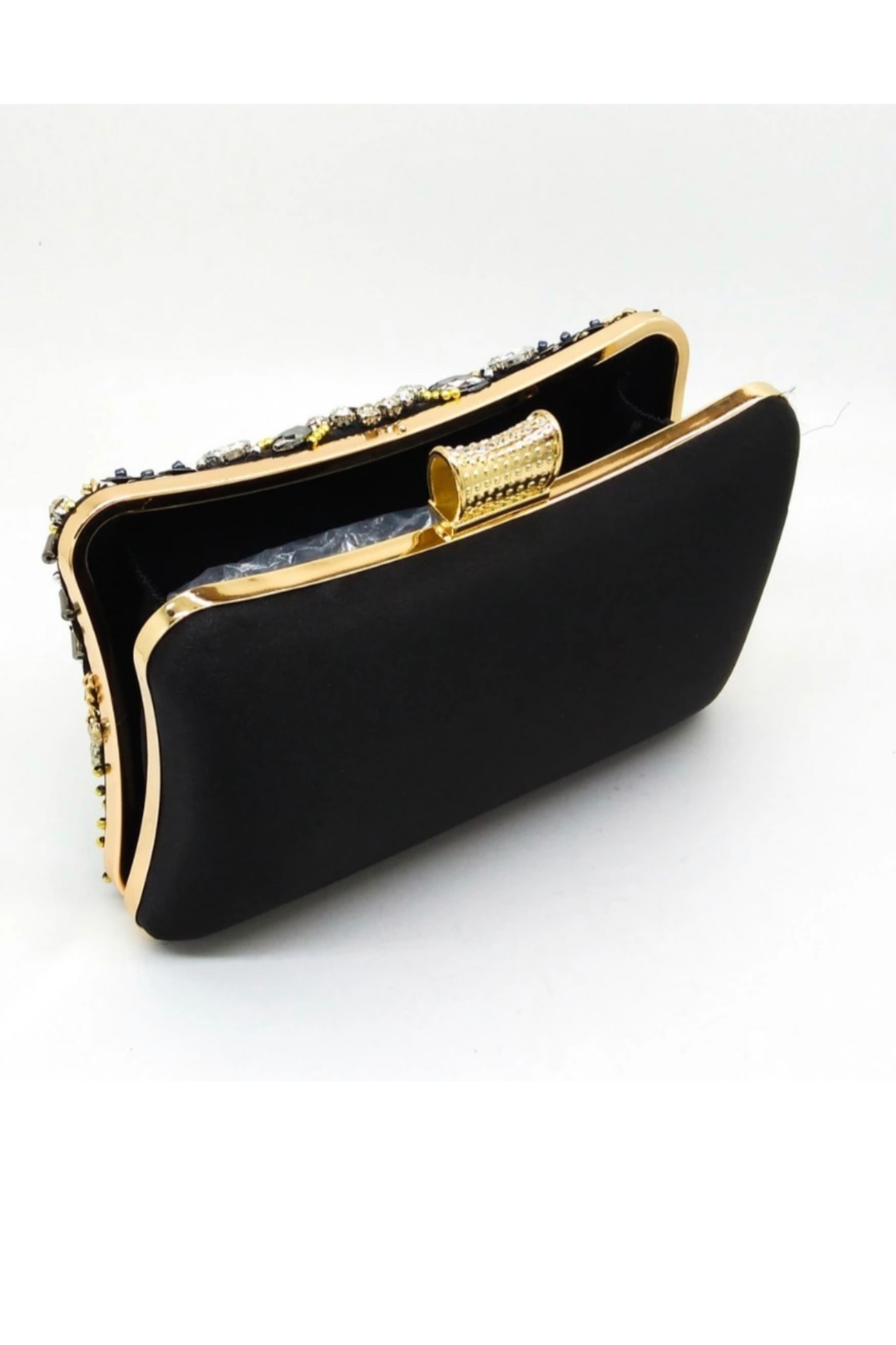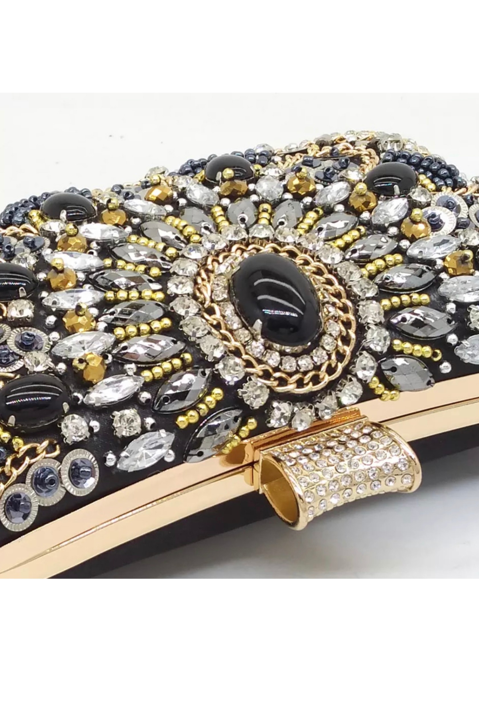 Siyah boncuk işlemeli metal gece çantası