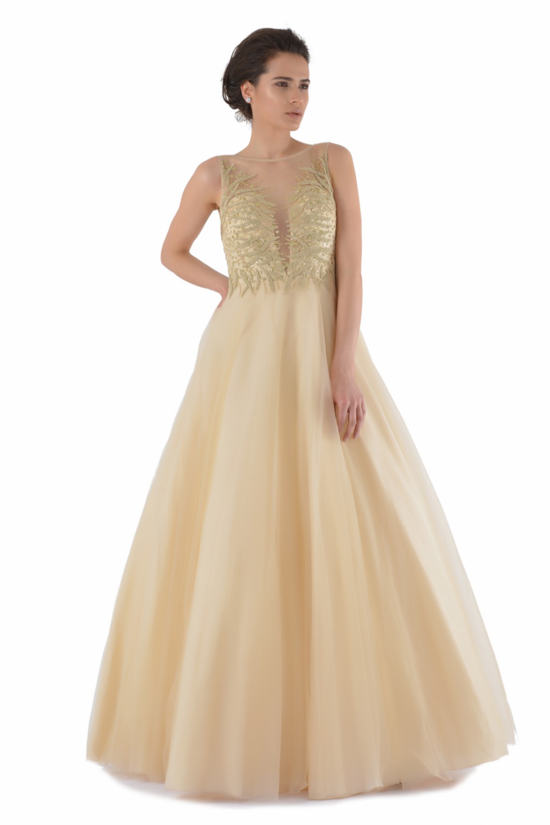 Kalın Askılı Göğsü Hayalet Tüllü Üstü İşlemeli Sırt Dekolteli Kabarık Gece Elbisesi