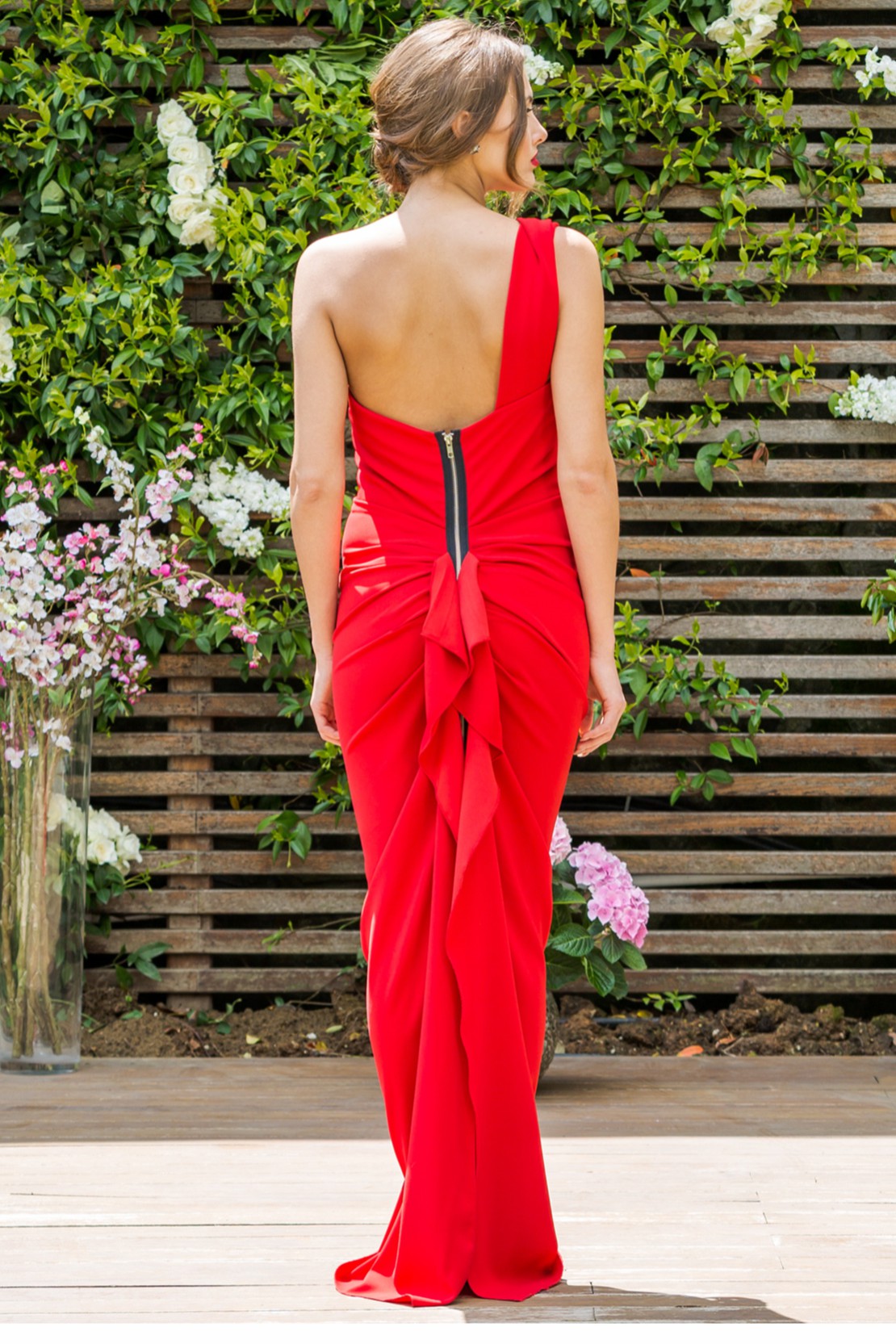 Tek Omuz Arkası Fırfırlı ve Yırtmaçlı Gece Elbisesi
