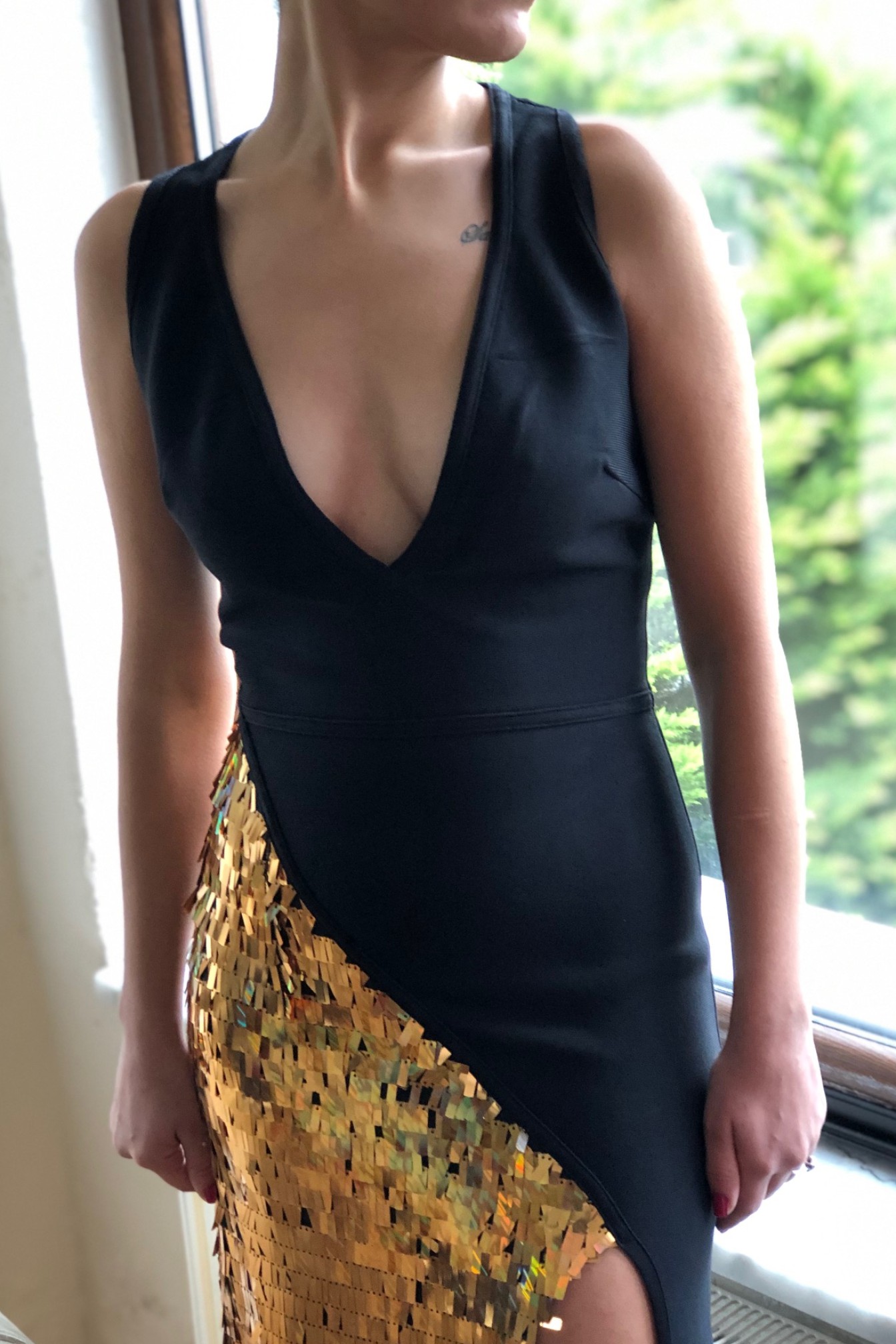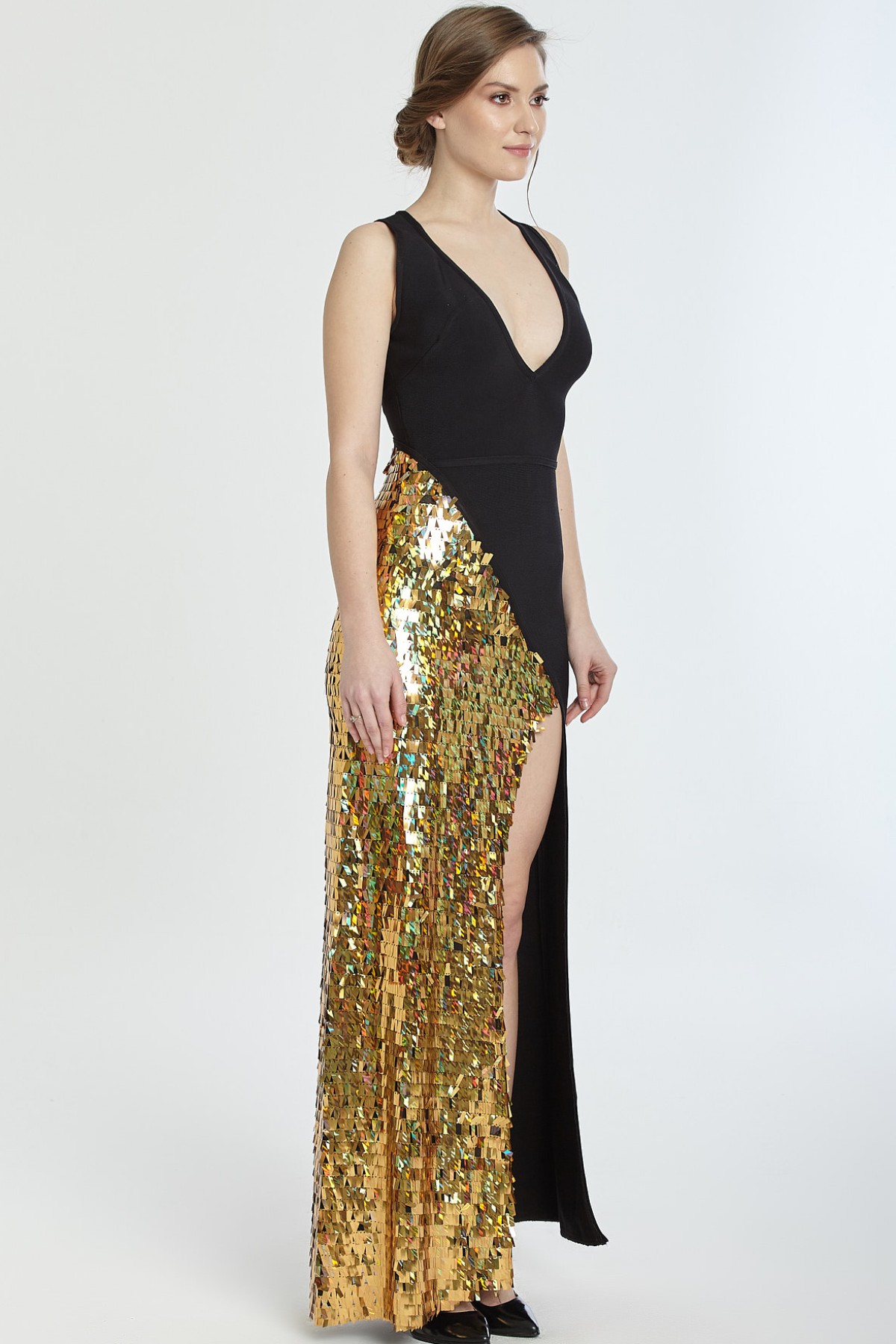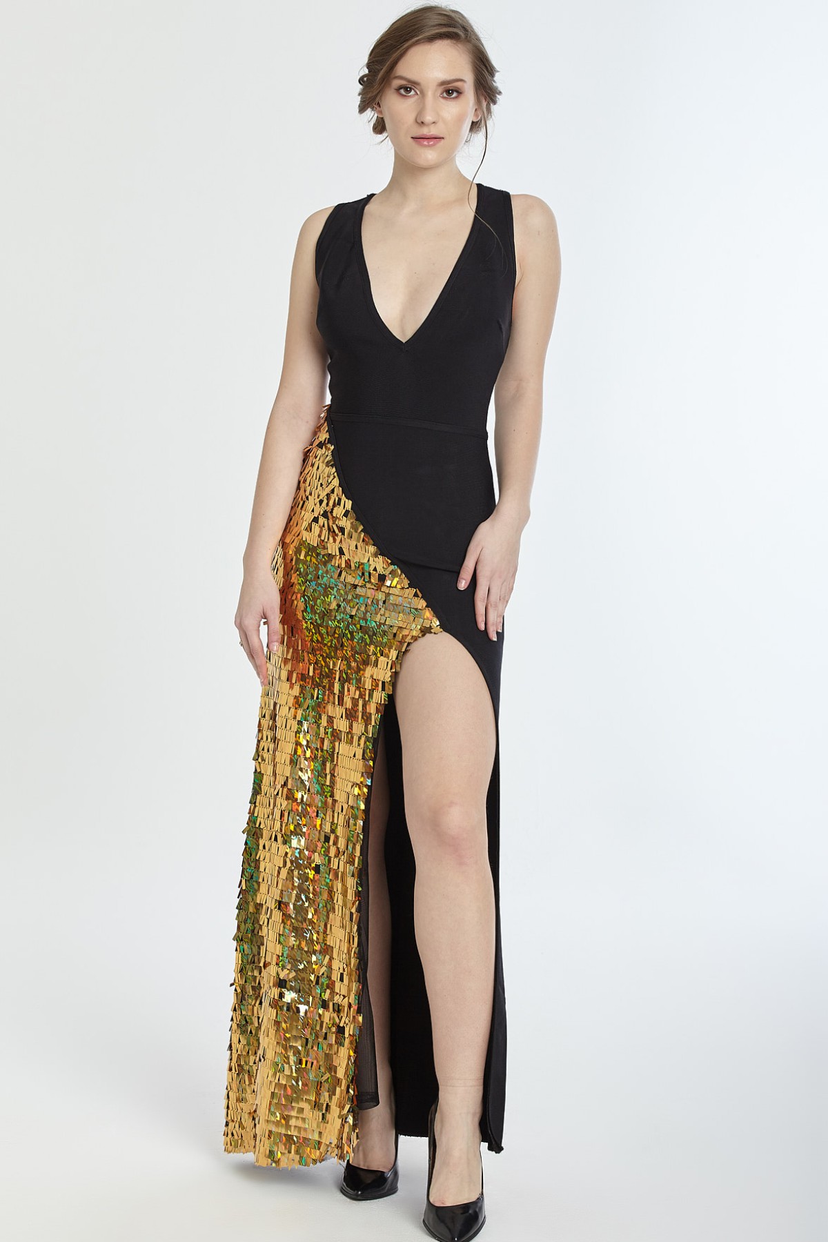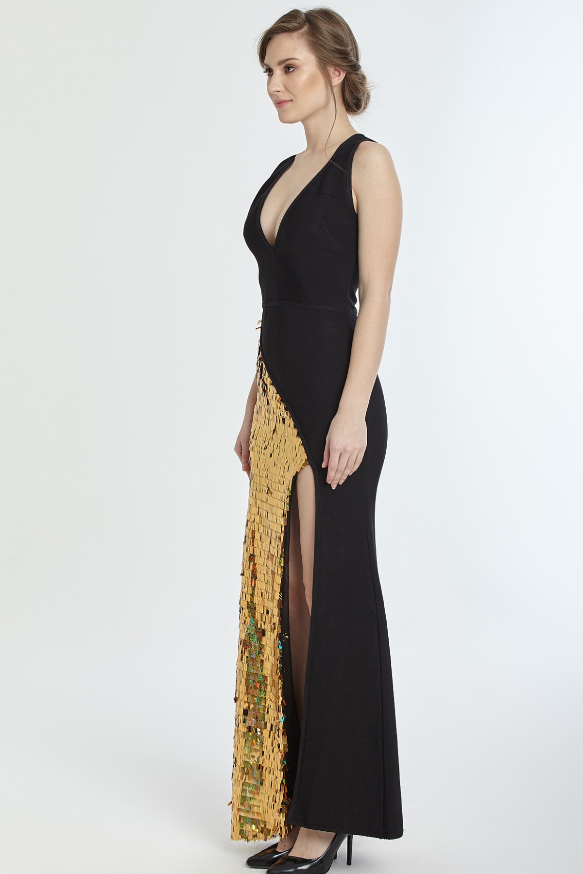 Derin göğüs dekolteli önden yırtmaçlı belden aşağısı tek taraf altın payet detaylı likralı gece elbisesi