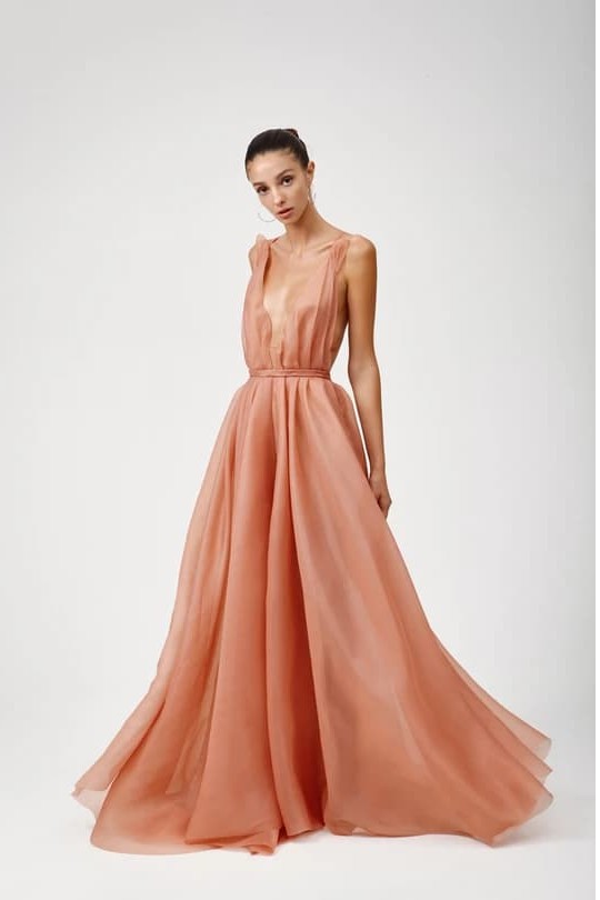 İnce Askılı Kısa Astarlı Göğüsten Başlayıp Eteklerde Devam Eden Pileli Sırt Dekolteli İpek Organze Kuyruklu Gece Elbisesi