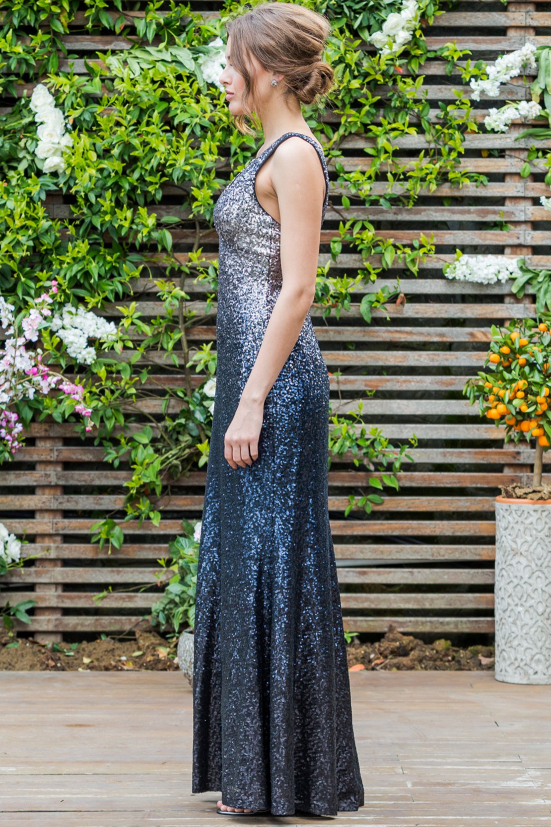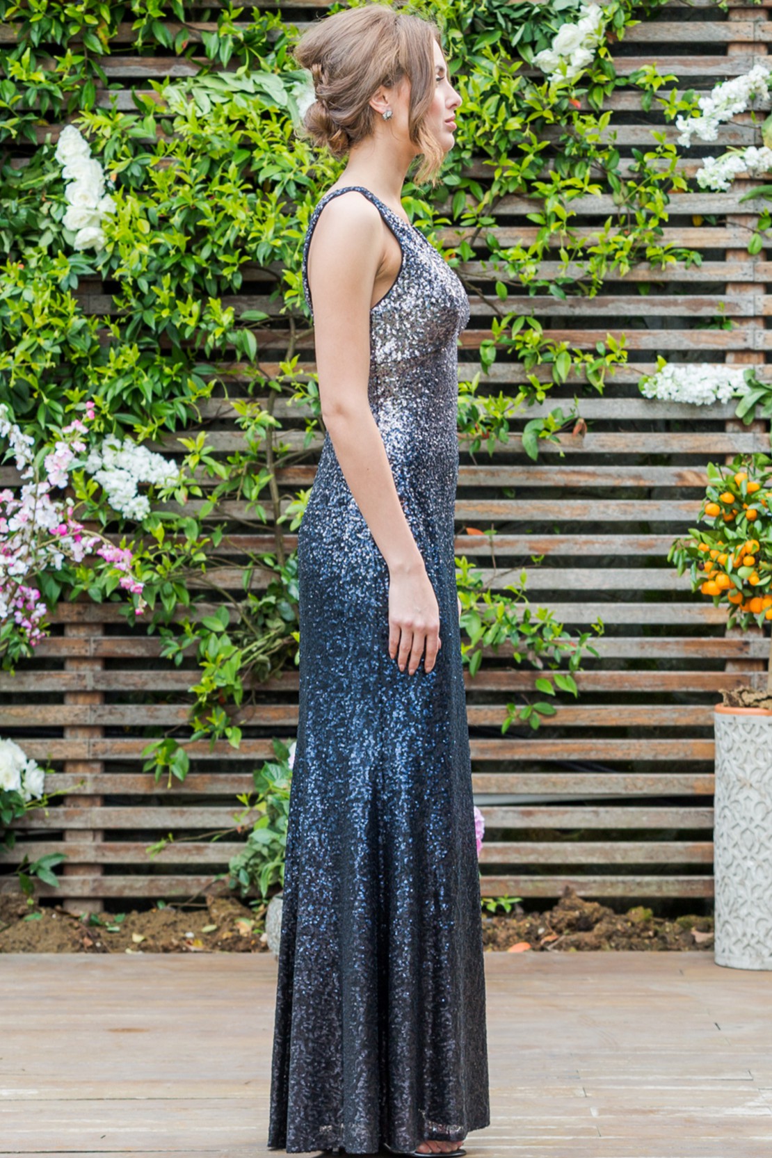 V Yaka Degradeli Payetli Arkadan Yırtmaçlı Gece Elbisesi