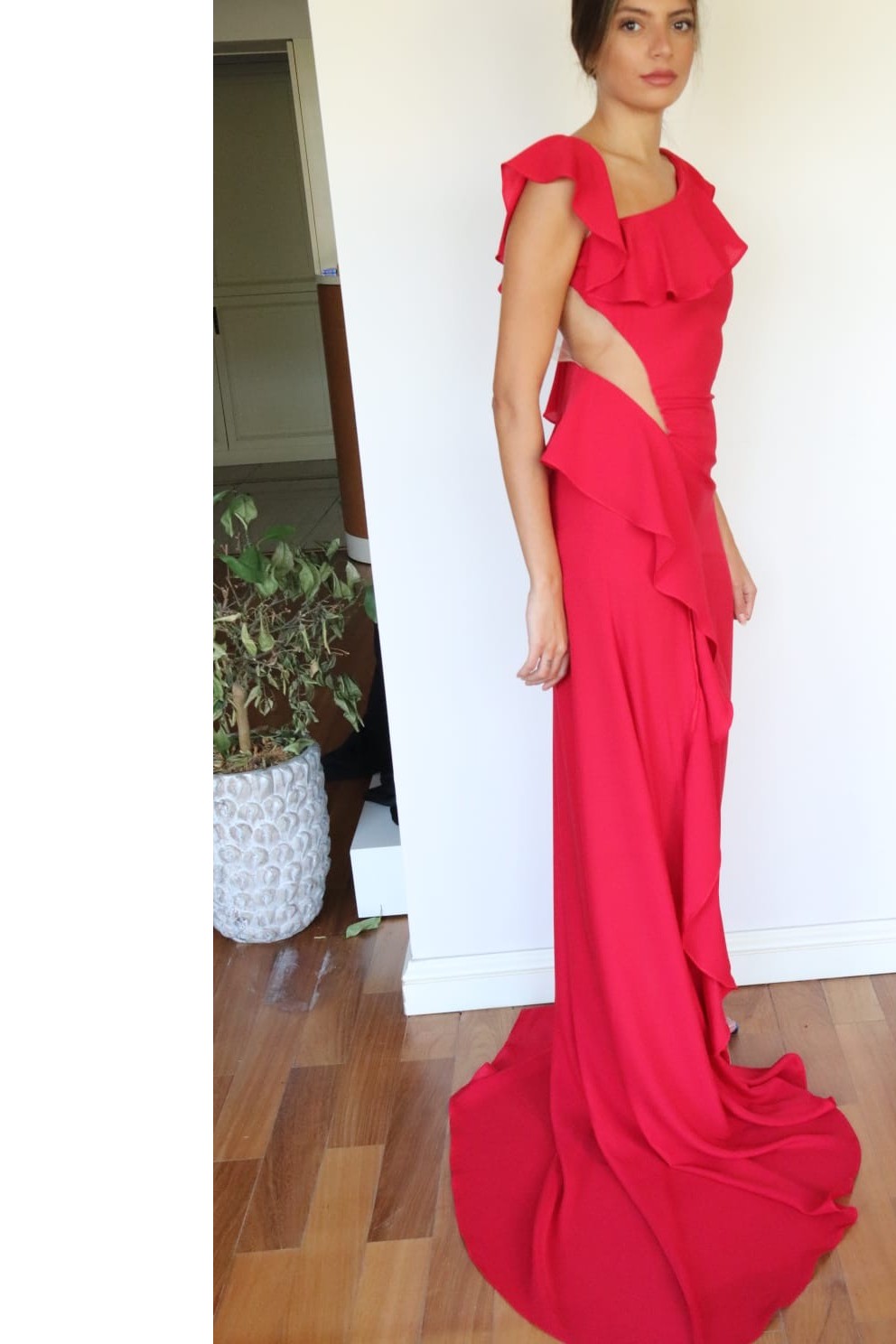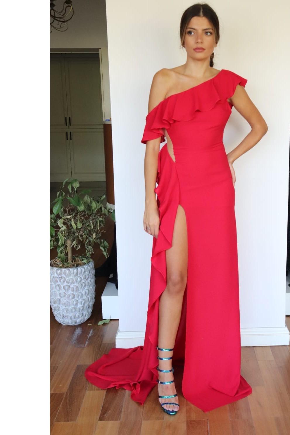 Kırmızının çarpıcılığını zarafet ve çekici bir şekilde ortaya koyan bu elbisede saçlarınızı toplayarak sırt ve yan tarafındaki detayı ortaya çıkarın. İsterseniz mor ya da başka kontrast renklerle ayakkbınızı tamamlayabilirsiniz. Kırmızı elbisenizi tamamen kırmızı tonlarıyla da tamamlarsanız yaratacağınız kusursuz görüntüyle gecenin en göz alıcı kadını siz olabilirsiniz.