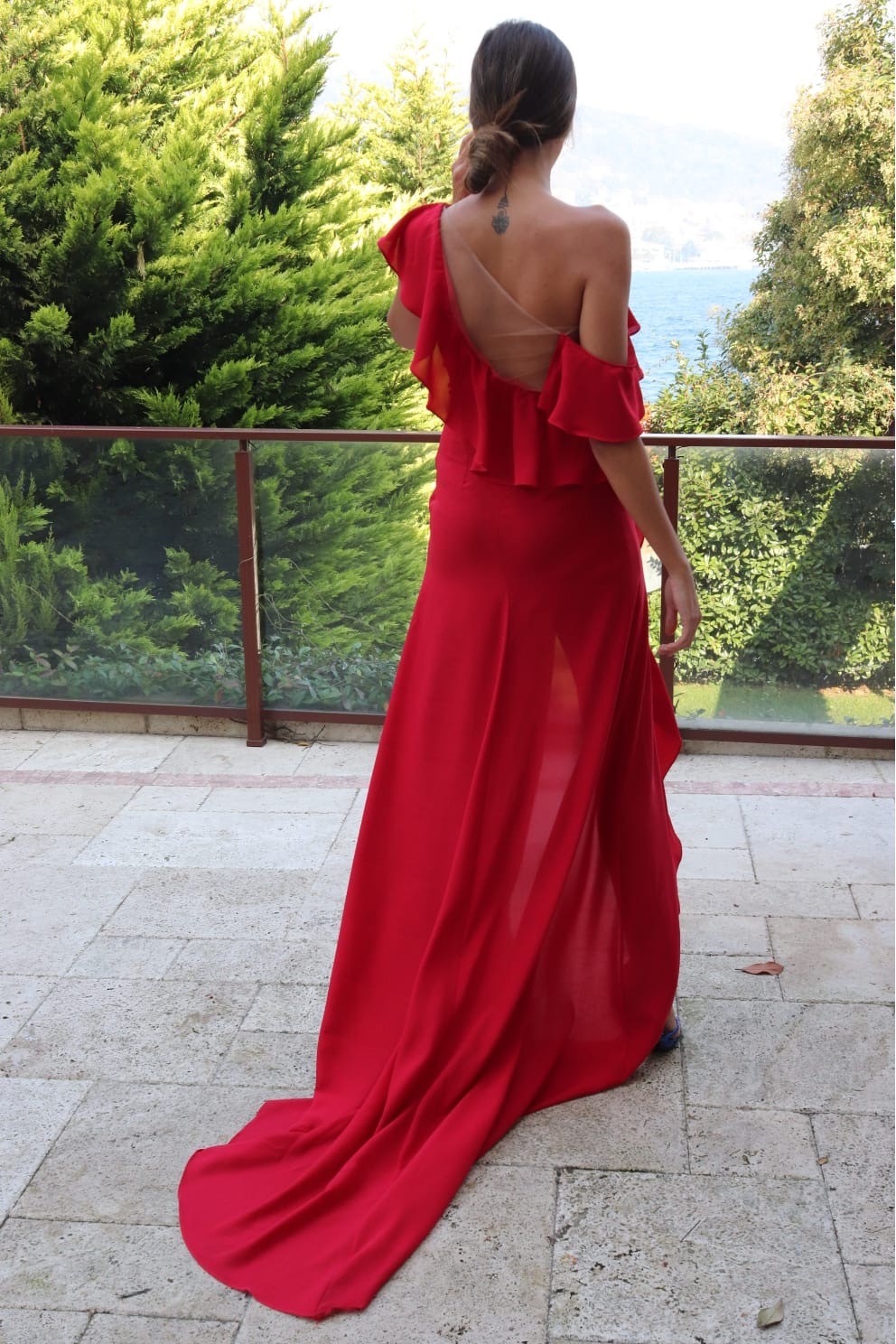Omuzları fırfır detaylı sırtı açık tek yan kısmı transparan derin yırtmaçlı kuyruklu şifon gece elbisesi