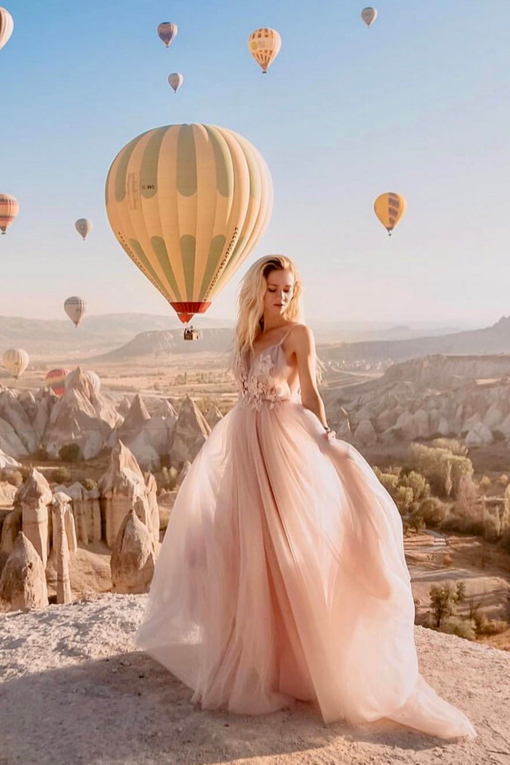 İnce askılı göğüs dekoltesinde üç boyutlu çiçek işlemeli sırtı açık tül abiye elbise