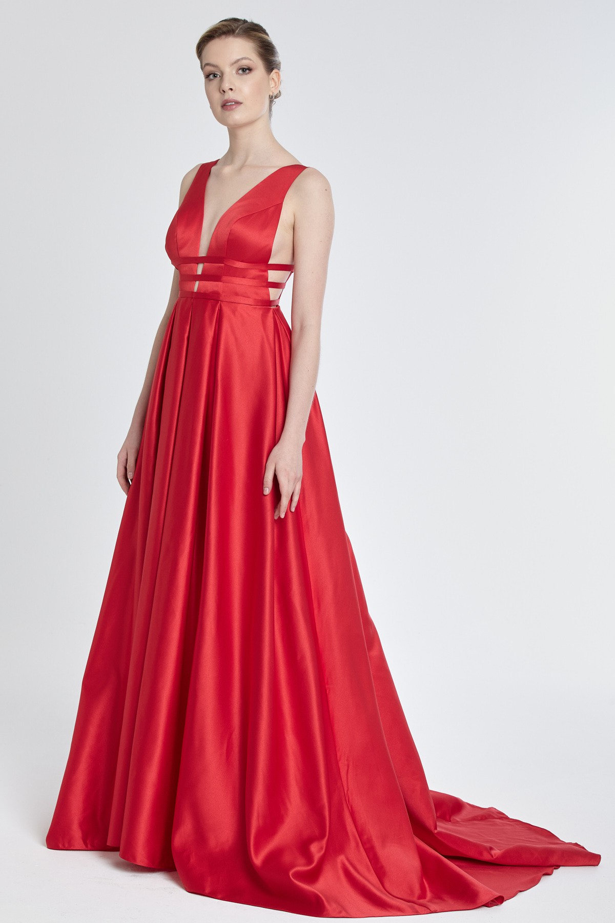 Sırt ve göğüs dekolteli göğüs altında ince üç şeritli kalın askılı kalın saten hafif kabarık kuyruklu gece elbisesi
