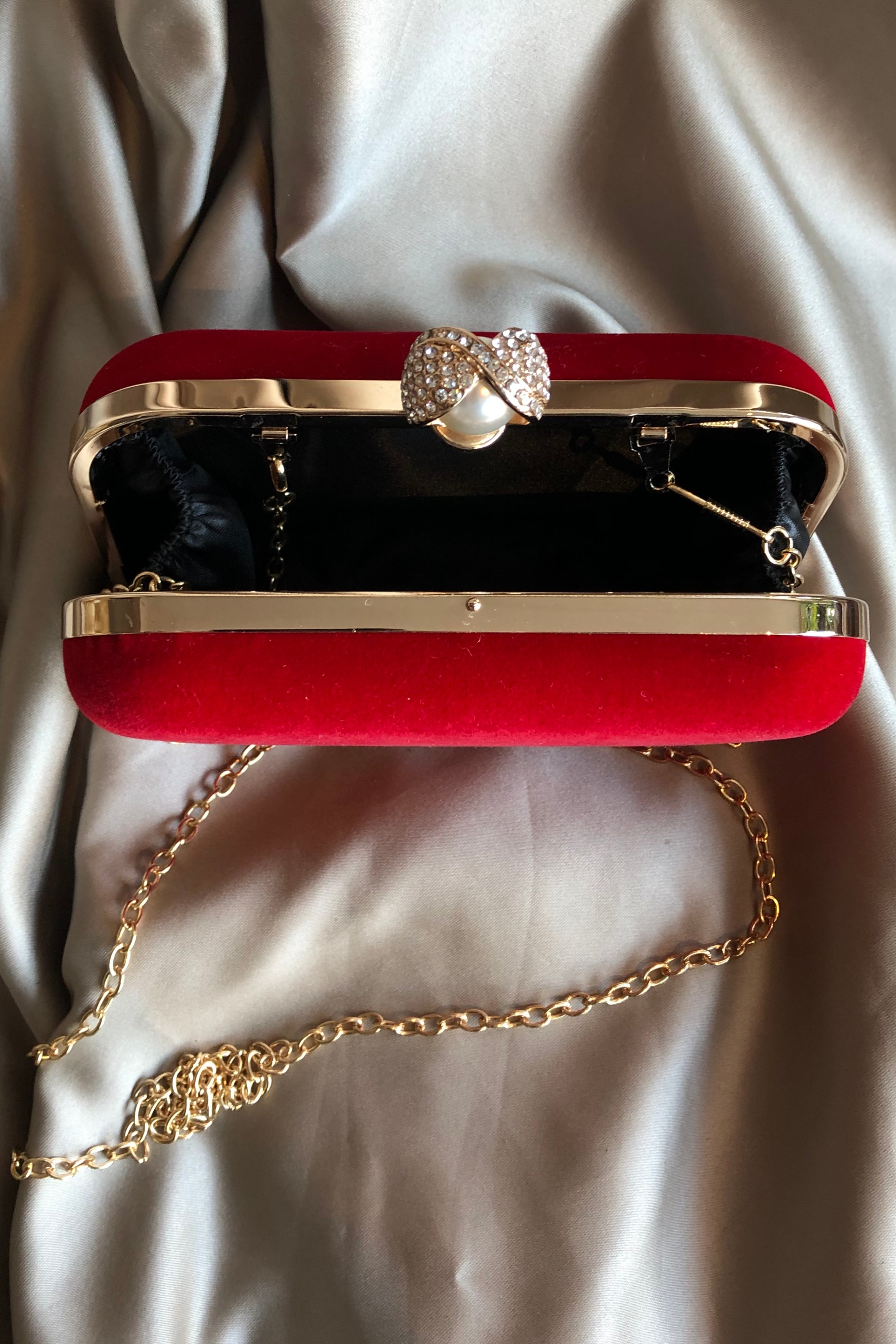 16cm x 10cm kadife kırmızı klipsi inci ve gold detaylı abiye çanta
