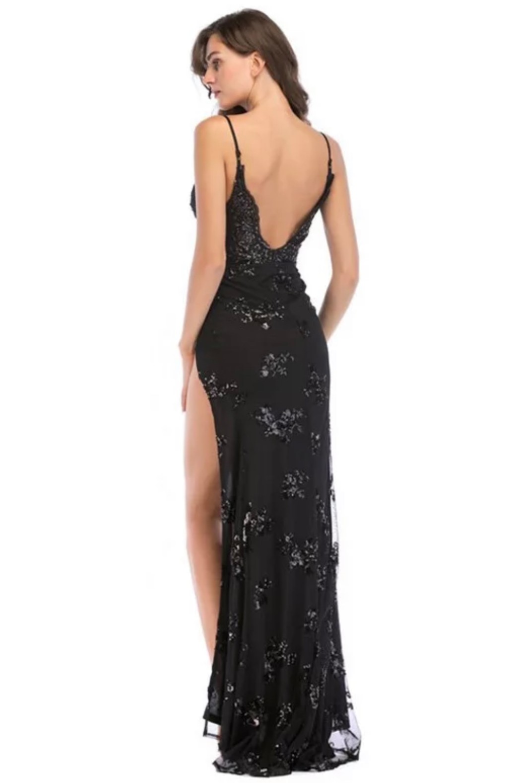 İnce askılı derin göğüs ve sırt dekolteli üzeri payet işlemeli derin yırtmaçlı gece elbisesi
