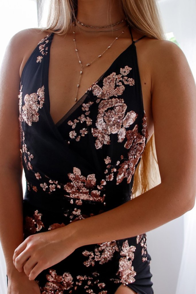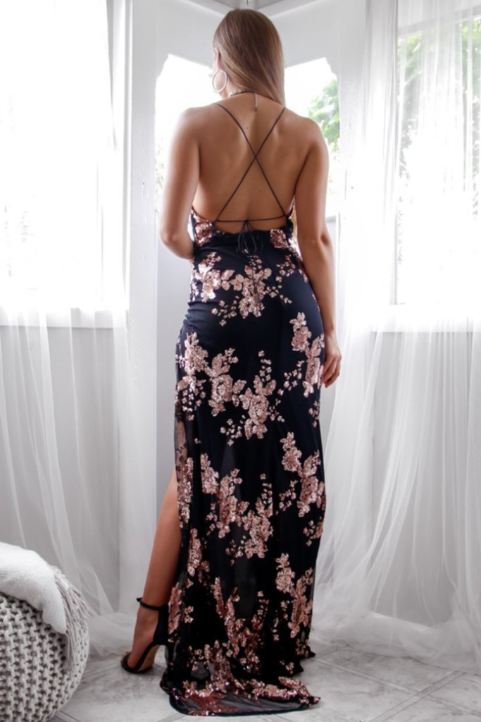 Kendinden bronz payet işlemeli göğüs ve sırt dekolteli sırtıince askı çapraz bağlamalı derin yırtmaçlı gece elbisesi