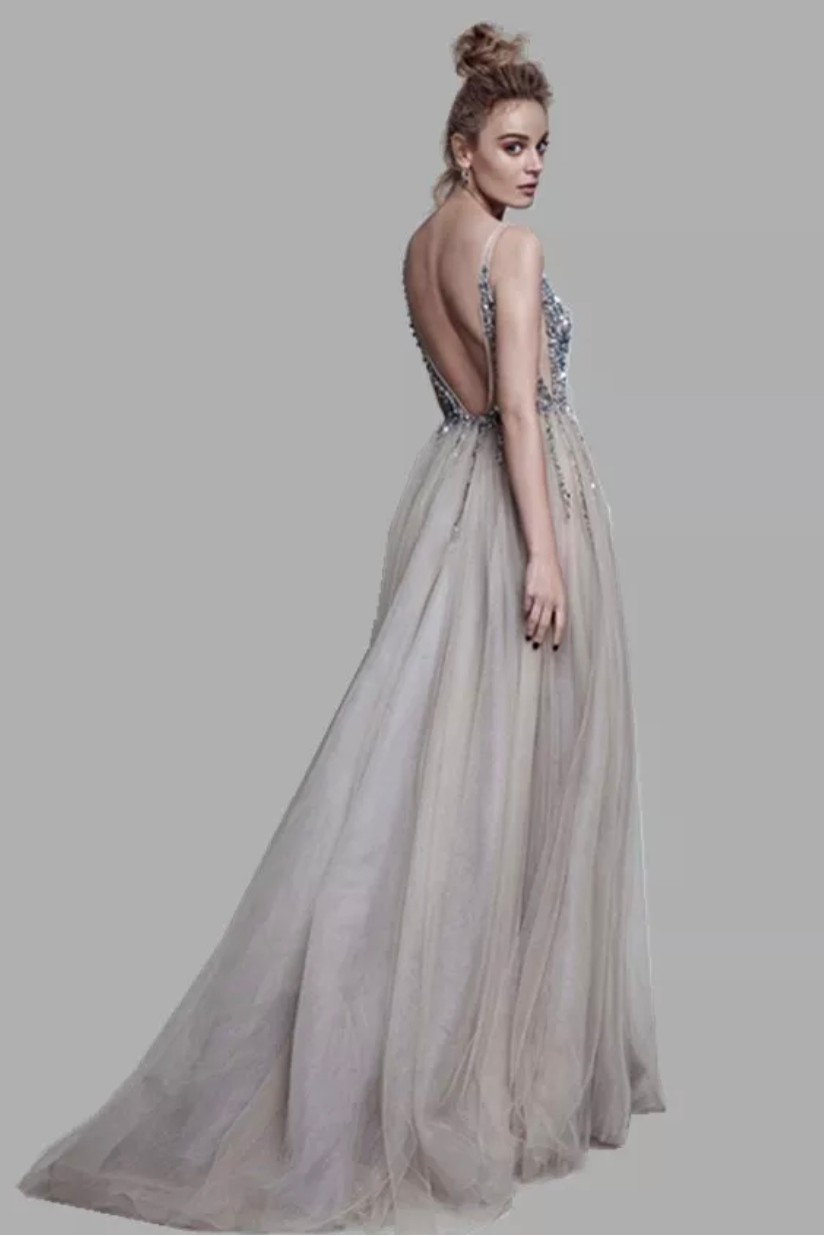 V yaka üst kısmı taş ve pul işlemeli sırtı açık etekleri tül çift derin yırtmaçlı gece elbisesi